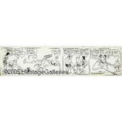 <B>Vincent T. Hamlin - Alley Oop Daily Comic Strip Original Art, dated 7-9-38 (NEA Service, 1938).</B></I> With a powerful premise, stylized and beautifully detailed artwork filled with a kinetic energy, and a distinctive supporting cast with well defined personalities, it's no surprise that <I>Alley Oop</B></I> became and remains one of the greatest adventure strips in history. Immortal brainchild of comic strip genius, V.T. Hamlin, Oop comes to the rescue of Ooola and Dinny the dinosaur in this daily from July 9, 1938. Hamlin lavishes these three panels with a symphony of fine inking and detailed lines. This rough and tumble strip measures 21" x 5.25" and has a 20.5" x 4.5" image area. There are some pencil notations along the upper right edge, otherwise this strip is in Excellent condition. This grand Oop daily can be yours - bid today!
