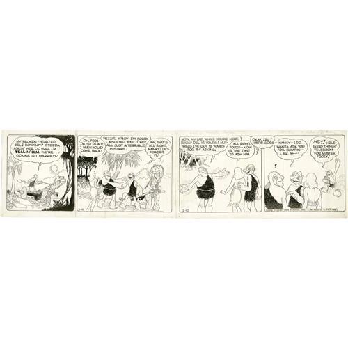<B>Vincent T. Hamlin - Alley Oop Daily Comic Strip Original Art, dated 2-10-39 (NEA Service, 1939).</B></I> Racing back to Rocky Del, Foozy is determined to ask Nanky for permission to marry his daughter, Zel. But wait, there's a teleboom for Mister Foozy! This daily is titled, "Wait a Minute Foozy," and has a 20.25" x 4.5" image area. You'll find some slight vertical stains running through several of the frames, and a fold along the center, otherwise the work is in Good condition.