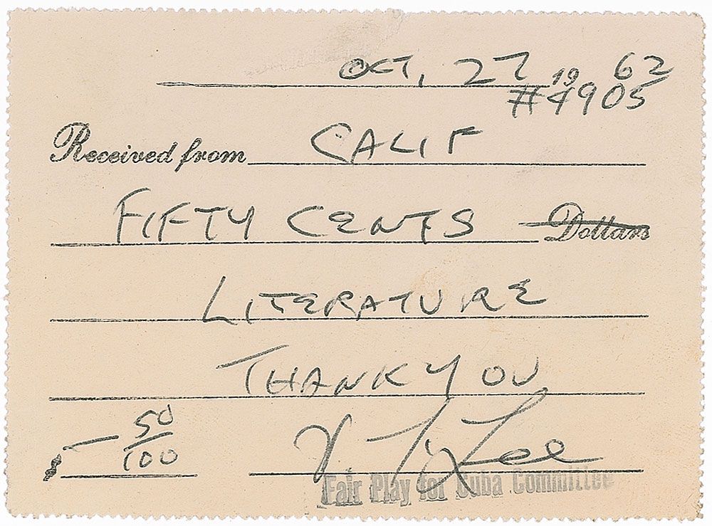 President of the Tampa chapter of the Fair Play for Cuba Committee who corresponded with Lee Harvey Oswald and later testified before the Warren Commission. Receipt for a purchase of fifty cents worth of literature from the Fair Play for Cuba committee, 4 x 3, October 27, 1962, signed at the conclusion, “V. T. Lee.” A tear to the top edge, otherwise fine condition. Accompanied by an original article published by the Committee, entitled ‘Stop the Cold War Against Cuba.’
