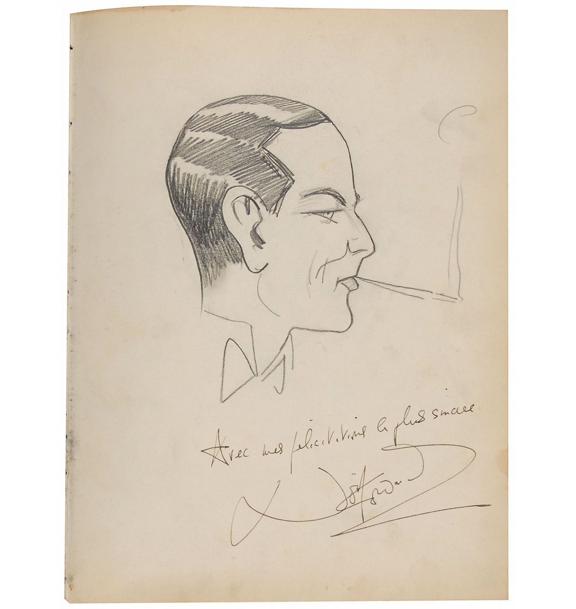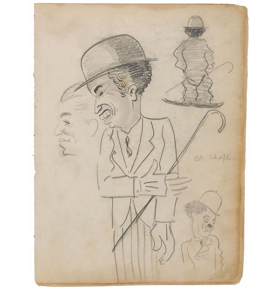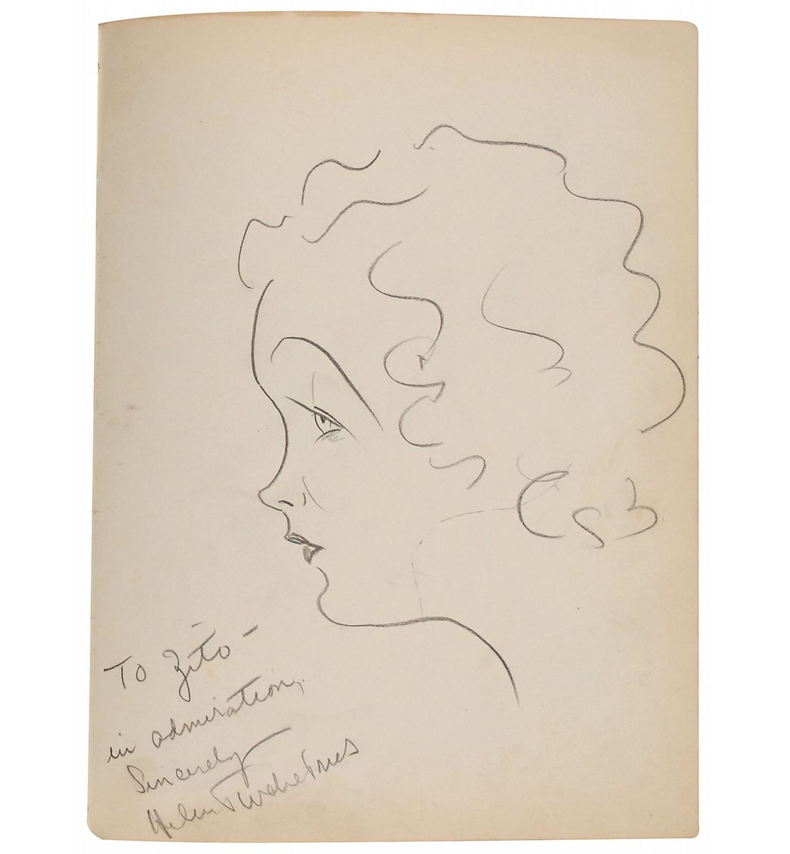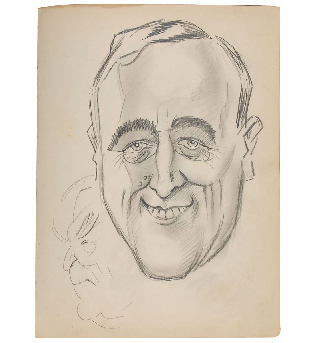 Zito (1900–1966) was a talented artist most famous for his caricatures of the celebrities he encountered throughout his life in both Europe and America, primarily working in Paris and Palm Beach. Original sketchbook used by famed caricaturist Vincenzo Maria Zito during the 1930s and 40s while in Paris, measuring approximately 8 x 10.5, containing over 80 caricatures of celebrities and notables, many of them signed by the subject. Signers are: Cole Porter, Noel Coward, Helen Twelvetrees, Jimmy Durante, Alfred Smith, Adolphe Menjou, Jack Donohue, Lester Allen, Harry Rosenthal, William Gaxton, Lili Damita, Irene Bordoni, Winnie Lightner, Joe Cook, George Jessel, Marc Connelly, Mickey Walker, Jack Pearl, Sophie Tucker, E. Ray Goetz, Lillian Roth, Margaret Livingston, Gertrude Lawrence, Alice White, Vivienne Segal, Henry Richman, Paul Whiteman, Helen Morgan, Gracie Allen, Marilyn Miller, Graham McNamee, and Ralph DePalma. Unsigned sketches include: Josephine Baker, Richard Barthelmess, Irving Berlin, Fanny Brice, Eddie Cantor, Charlie Chaplin, Maurice Chevalier, Douglas Fairbanks, Mohandas Gandhi, Greta Garbo, George Gershwin, Walter Hagen, Adolf Hitler, Walter Huston, Emil Jannings, Bobby Jones, John F. Kennedy, Jr., Fritz Kreisler, Thomas Lipton, Ramon Novarro, John Rockefeller, Will Rogers, Franklin D. Roosevelt, Horton Smith, Igor Stravinsky, Gloria Swanson, Lawrence Tibbett, Bill Tilden, Rudolph Valentino, and Joe Zelli. Individual pages in fine condition with light toning and chipping; sketchbook cover has separated and binding is loose. Accompanied by a scrapbook containing a few contemporary newspaper articles about Zito and his work. These caricatures are fantastic works of art in themselves and adroitly express the personality of every figure as well as their physical appearance. The full sketchbook is a testament to Zito’s talent as an artist and captures the essence of the era’s popular culture.