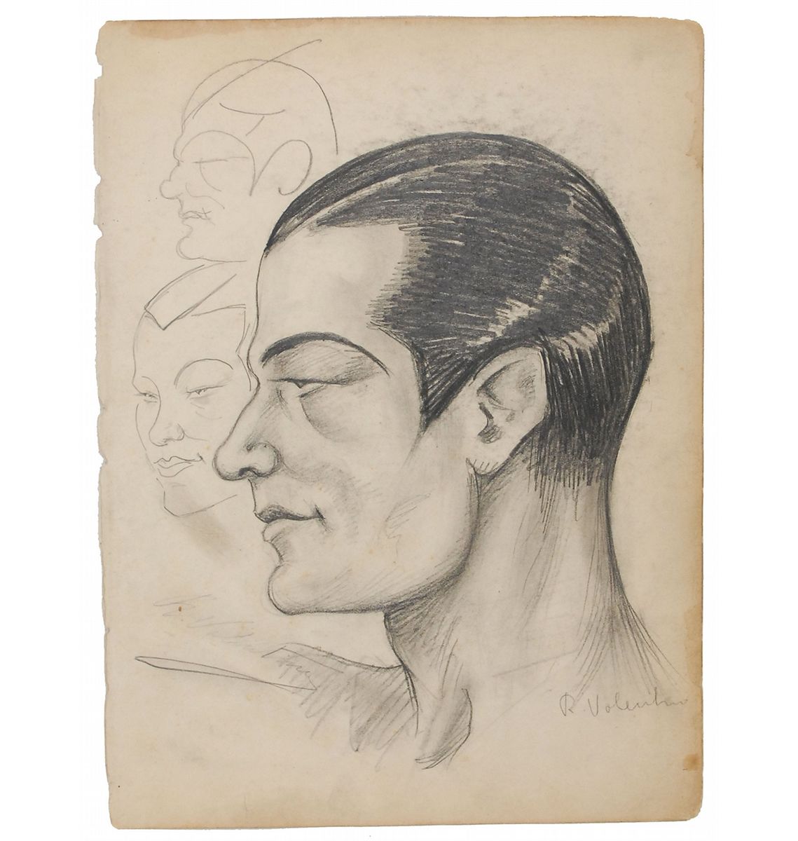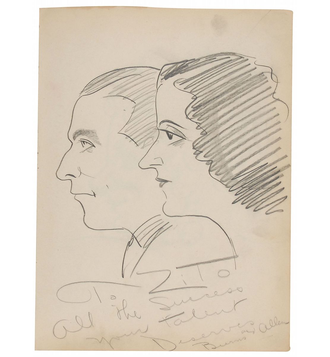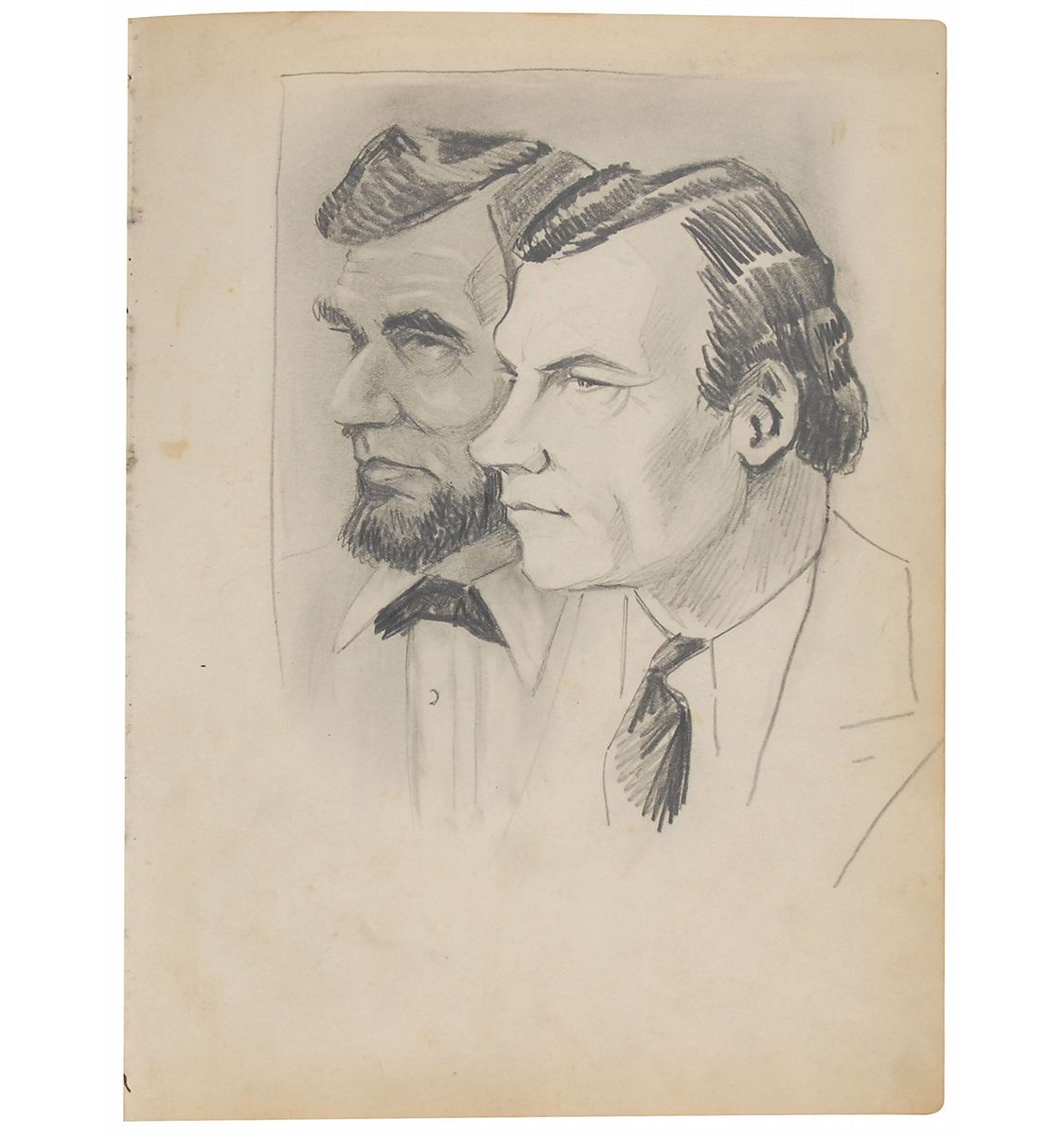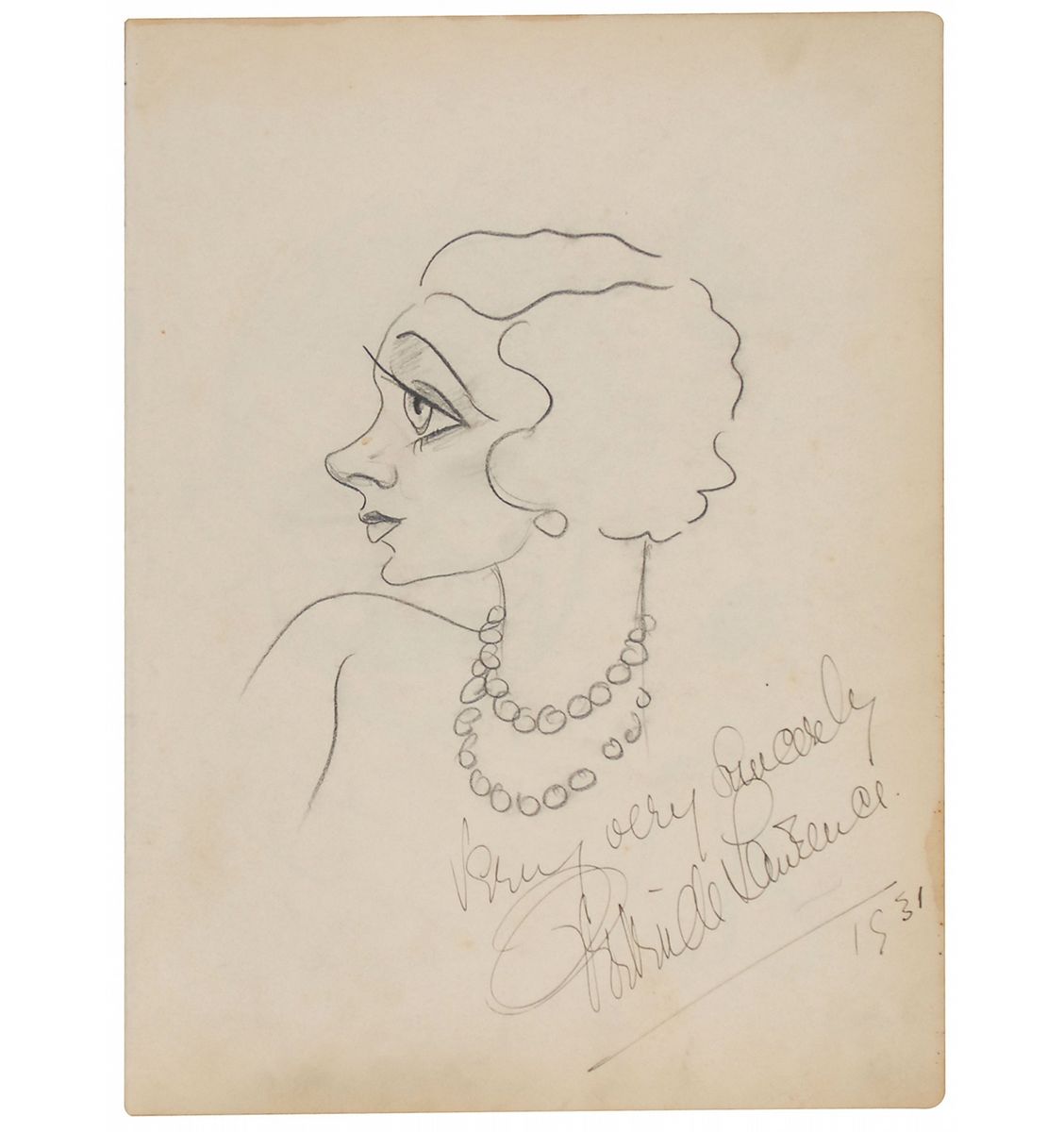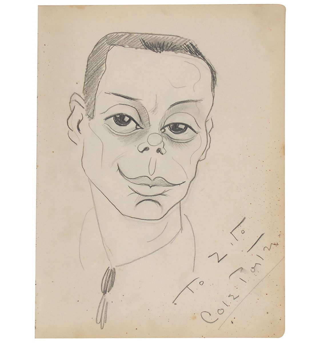 Zito (1900–1966) was a talented artist most famous for his caricatures of the celebrities he encountered throughout his life in both Europe and America, primarily working in Paris and Palm Beach. Original sketchbook used by famed caricaturist Vincenzo Maria Zito during the 1930s and 40s while in Paris, measuring approximately 8 x 10.5, containing over 80 caricatures of celebrities and notables, many of them signed by the subject. Signers are: Cole Porter, Noel Coward, Helen Twelvetrees, Jimmy Durante, Alfred Smith, Adolphe Menjou, Jack Donohue, Lester Allen, Harry Rosenthal, William Gaxton, Lili Damita, Irene Bordoni, Winnie Lightner, Joe Cook, George Jessel, Marc Connelly, Mickey Walker, Jack Pearl, Sophie Tucker, E. Ray Goetz, Lillian Roth, Margaret Livingston, Gertrude Lawrence, Alice White, Vivienne Segal, Henry Richman, Paul Whiteman, Helen Morgan, Gracie Allen, Marilyn Miller, Graham McNamee, and Ralph DePalma. Unsigned sketches include: Josephine Baker, Richard Barthelmess, Irving Berlin, Fanny Brice, Eddie Cantor, Charlie Chaplin, Maurice Chevalier, Douglas Fairbanks, Mohandas Gandhi, Greta Garbo, George Gershwin, Walter Hagen, Adolf Hitler, Walter Huston, Emil Jannings, Bobby Jones, John F. Kennedy, Jr., Fritz Kreisler, Thomas Lipton, Ramon Novarro, John Rockefeller, Will Rogers, Franklin D. Roosevelt, Horton Smith, Igor Stravinsky, Gloria Swanson, Lawrence Tibbett, Bill Tilden, Rudolph Valentino, and Joe Zelli. Individual pages in fine condition with light toning and chipping; sketchbook cover has separated and binding is loose. Accompanied by a scrapbook containing a few contemporary newspaper articles about Zito and his work. These caricatures are fantastic works of art in themselves and adroitly express the personality of every figure as well as their physical appearance. The full sketchbook is a testament to Zito’s talent as an artist and captures the essence of the era’s popular culture.