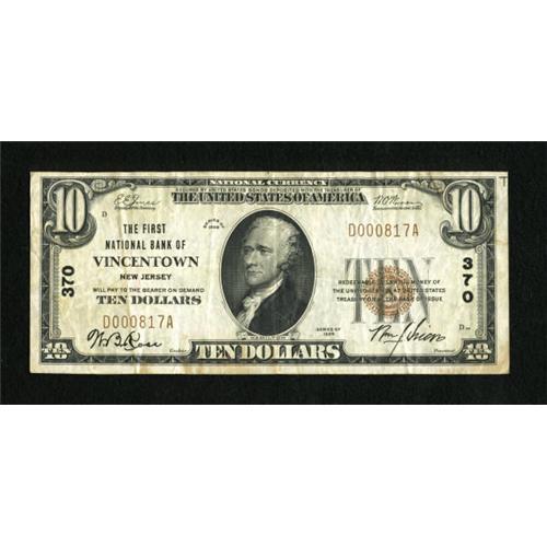 <B>Vincentown, NJ</B></I> - $10 1929 Ty. 1 <B>The First NB</B></I> Ch. # 370<BR> A pleasing <B>Very Fine</B></I> note that has solid margins with a touch of staining noticed.<BR><I>From The John Ameen Collection</B></I><BR><BR><b>Shipping:</b> Coins & Currency (<a target="_blank" href="http://www.heritageauctions.com/common/shipping.php">view shipping information</a>)