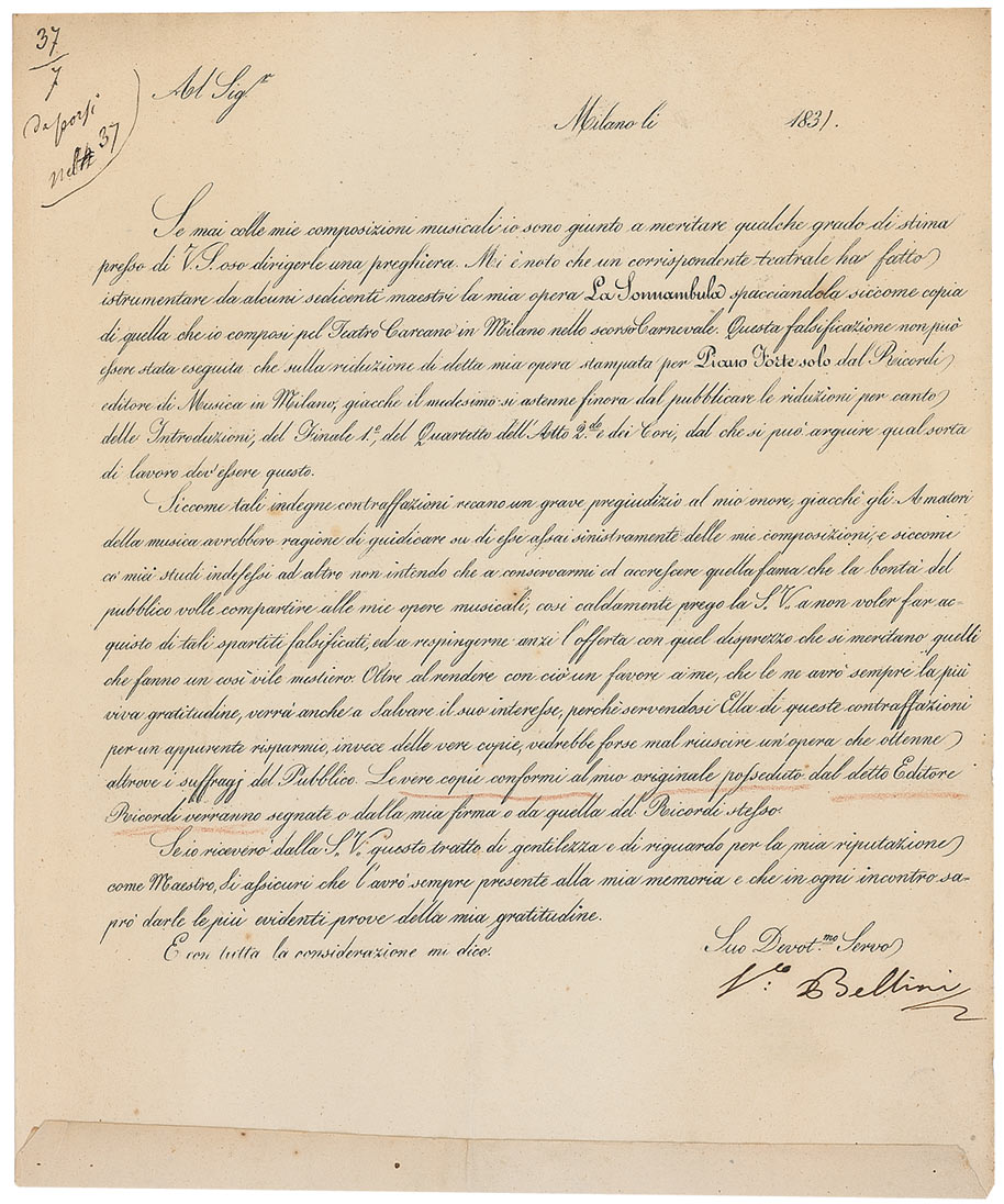 The 19th century music industry was rife with unscrupulous publishers and counterfeit examples of various compositions, an issue confronted here by Bellini. “As such unworthy counterfeits severely prejudice my honor, since music lovers would have reason to judge my compositions quite negatively on their basis,” he proclaims in his own defense via this circular. Among those works that fell victim to such tactics was ‘The Sleepwalker,’ with “some self-proclaimed composers, passing it off as a copy of the opera that I composed.” Besides the unethical implications, such undertakings also had financial implications as publishers such as Ricordi were less willing to spend funds on authentic scores when a plethora of pirated works were readily available throughout Europe.