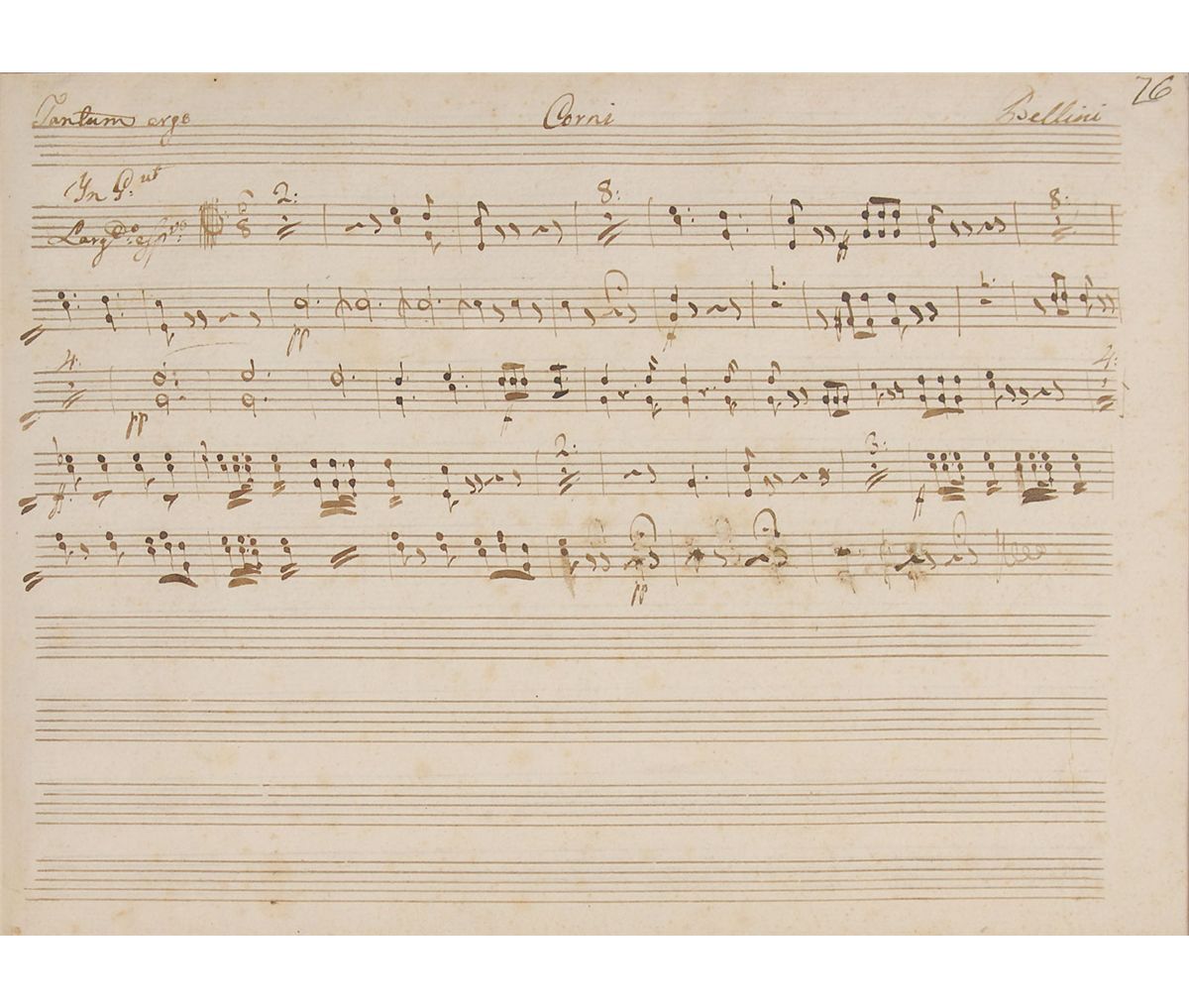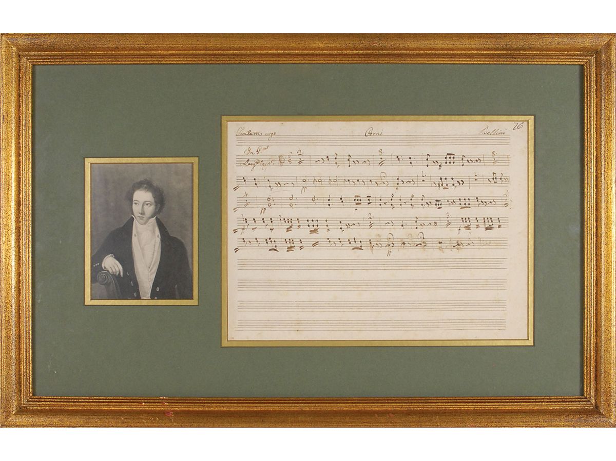 Italian composer (1801–1835). Impressive and scarce musical manuscript in Bellini’s hand, on a 10.75 x 8 musically-lined sheet, identified along the top, “Corni.” The composer pens 42 intricate bars of music, and signs, “Bellini,” in the upper right corner of the sheet. Double-matted and framed to an overall size of 22.5 x 14.5. In fine condition, with some scattered light toning and foxing. An organist’s son, Bellini was sent by a Sicilian nobleman to the Conservatorio of Naples. ‘Il Pirata’ carried his name beyond Italy, but is best known for ‘La Sonnambula’ and ‘Norma.’ He would come to influence several later operatic composers, including Wagner.