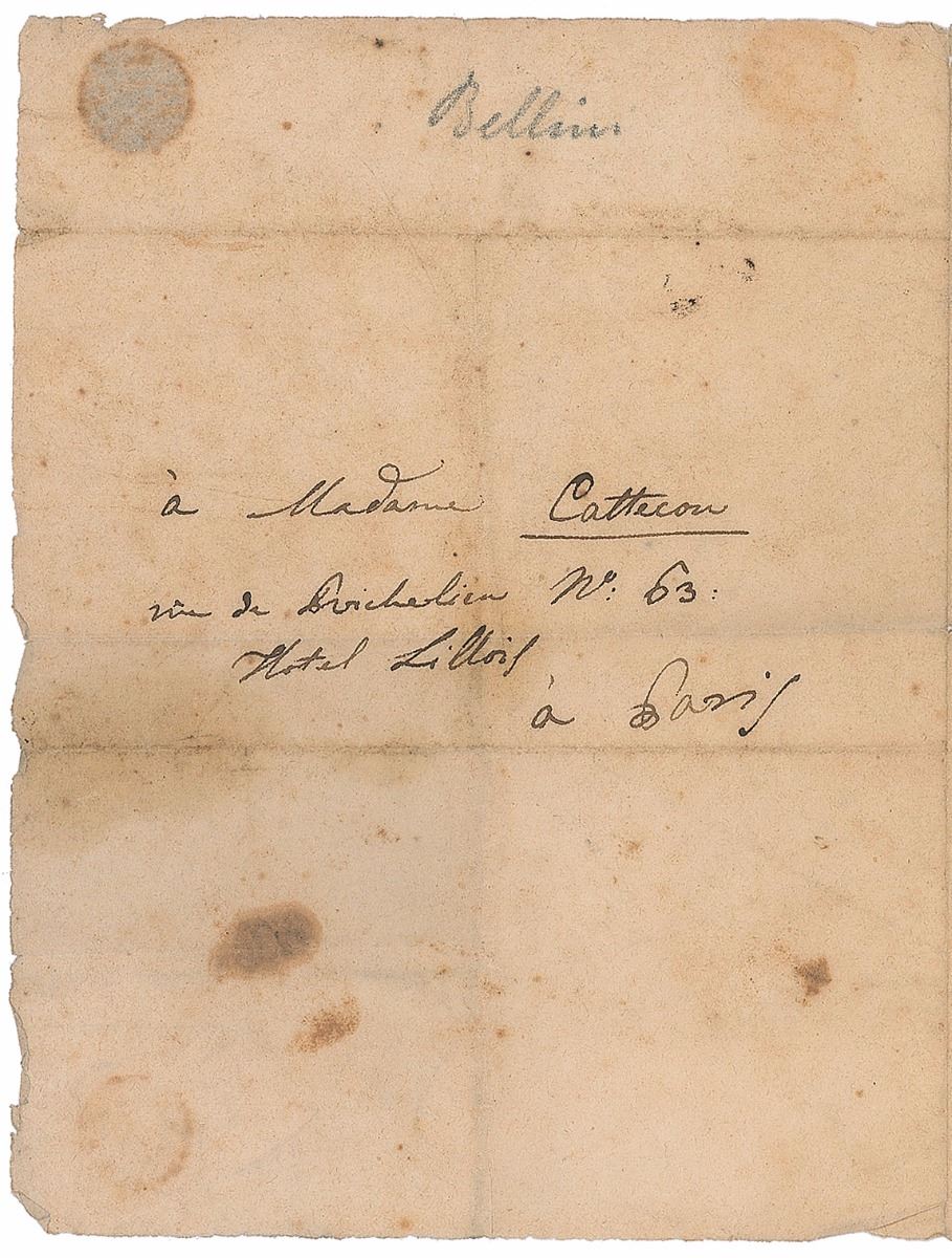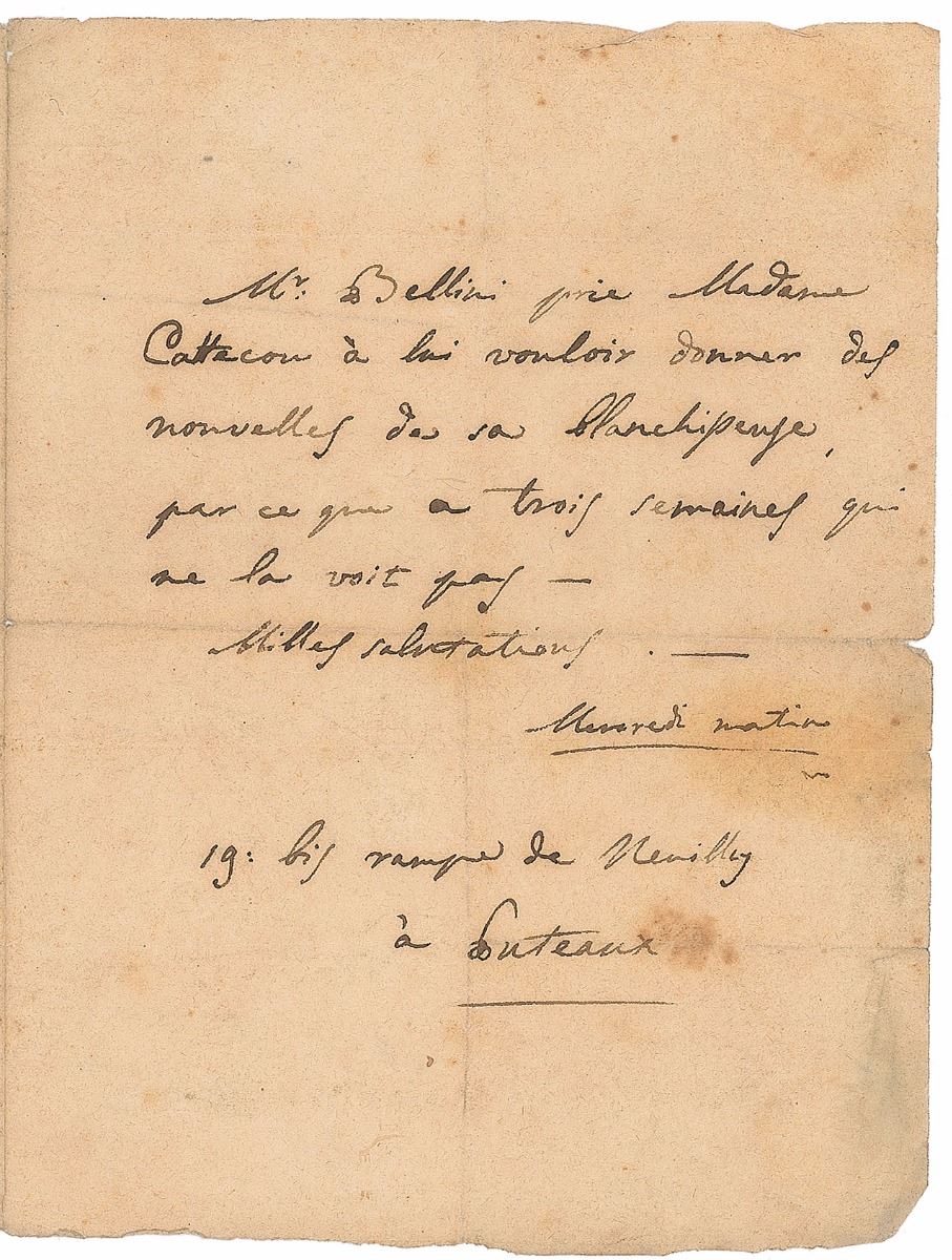 Italian opera composer (1801–1835) known for his extremely long, flowing melodic lines. Third-person ALS in French signed within the text, “Mr. Bellini,” one page, 4 x 5.25, no date but circa mid-1830s. Untranslated letter to a woman at the Paris Hotel Lillois in search of his missing washer-woman. In very good condition, with central vertical and horizontal folds, light overall wrinkling, and scattered dampstaining.