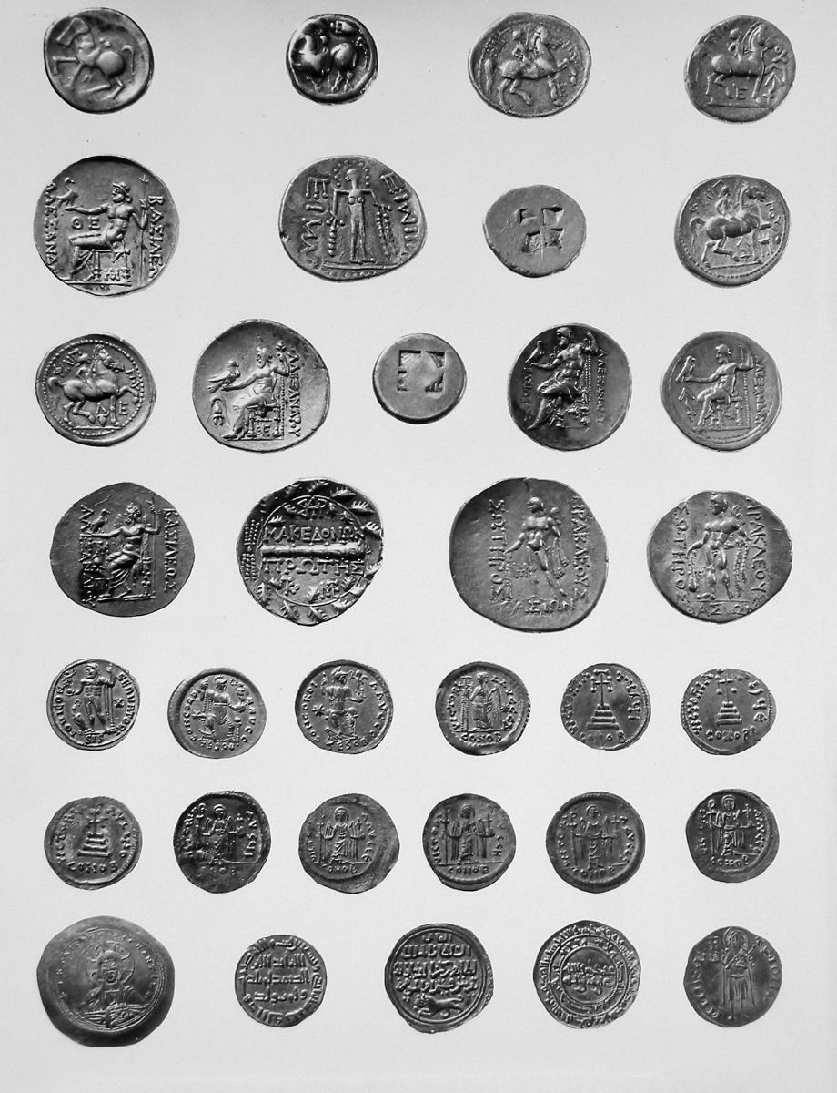 Vinchon, Jean. COLLECTION MAY. MONNAIES ANTIQUES EN OR ET EN ARGENT. Versailles, 24 octobre 1965. 8vo, original pictorial card covers. (16) pages; 42 lots of coins; illustrated on two halftone plates; two fine photographic plates of the same coins as depicted in the halftones, laid in. List of prices realized laid in. Fine or nearly so. A small but very nice sale of ancient and medieval coins. The two photographic plates laid into this copy are the same photographs reproduced via halftones in the catalogue, but are actual photographs providing much greater clarity and richness of detail. We find no mention of these plates in the literature.