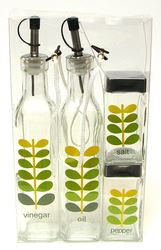 Glass 4 piece cooking set, Vinegar, oil, salt and pepper. The vigar and oil have rubber stoppers and rubber caps, each measuring10"H x 1.75"W. Salt and pepper measure 3.5"H x 1.75"W.