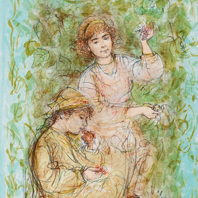 "Vineyard" is a limited edition lithograph on paper, numbered and hand signed by Edna Hibel (1917-2014). Includes Certificate of Authenticity! Measures approx. 18" x 22" (with border), 13" x 18" (image).
