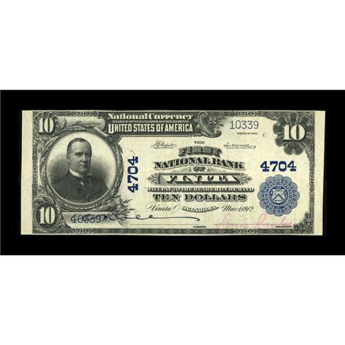 <B>Vinita, OK</B></I> - $10 1902 Plain Back Fr. 628 <B>The First NB</B></I> Ch. # 4704<BR>A nice example which is one of the higher grade Third Charters we've encountered from here. <B>Very Fine.</B></I><BR><BR><b>Shipping:</b> Coins & Currency (<a target="_blank" href="http://www.heritageauctions.com/common/shipping.php">view shipping information</a>)
