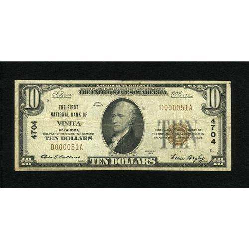 <B>Vinita, OK</B></I> - $10 1929 Ty. 1 <B>The First NB</B></I> Ch. # 4704<BR>An attractive issue with the low serial number D000051A. <B>Fine-Very Fine.</B></I><BR><BR><b>Shipping:</b> Coins & Currency (<a target="_blank" href="http://www.heritageauctions.com/common/shipping.php">view shipping information</a>)