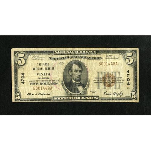 <B>Vinita, OK</B></I> - $5 1929 Ty. 1 <B>The First NB</B></I> Ch. # 4704<BR> A couple of teller stamps are exhibited on this circulated example with a slight margin tear. <B>Very Good</B></I>.<BR><I><BR>From The Rolling Plains Collection</B></I><BR><BR><b>Shipping:</b> Coins & Currency (<a target="_blank" href="http://www.heritageauctions.com/common/shipping.php">view shipping information</a>)