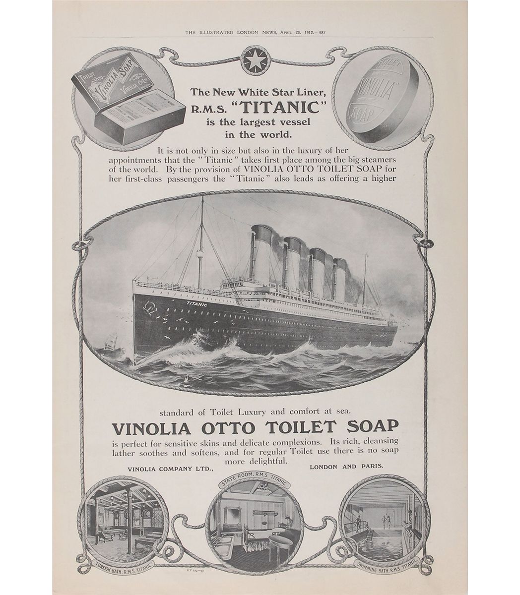Ad for Vinolia Otto Toilet Soap removed from the April 20, 1912, issue of the Illustrated London News, 11.5 x 16.25, featuring a large artist’s rendition of the Titanic in the center and drawings of the interior below, captioned at the top: "The New White Star Liner, R.M.S. ‘Titanic’ is the largest vessel in the world. It is not only in size but also in the luxury of her appointments that the ‘Titanic’ takes first place among the big steamers of the world. By the provision of Vinolia Otto Toilet Soap for her first-class passengers the ‘Titanic’ also leads as offering a higher standard of Toilet Luxury and comfort at sea.” In fine condition. An interesting ad in that it continued to run for at least some time after the disaster.