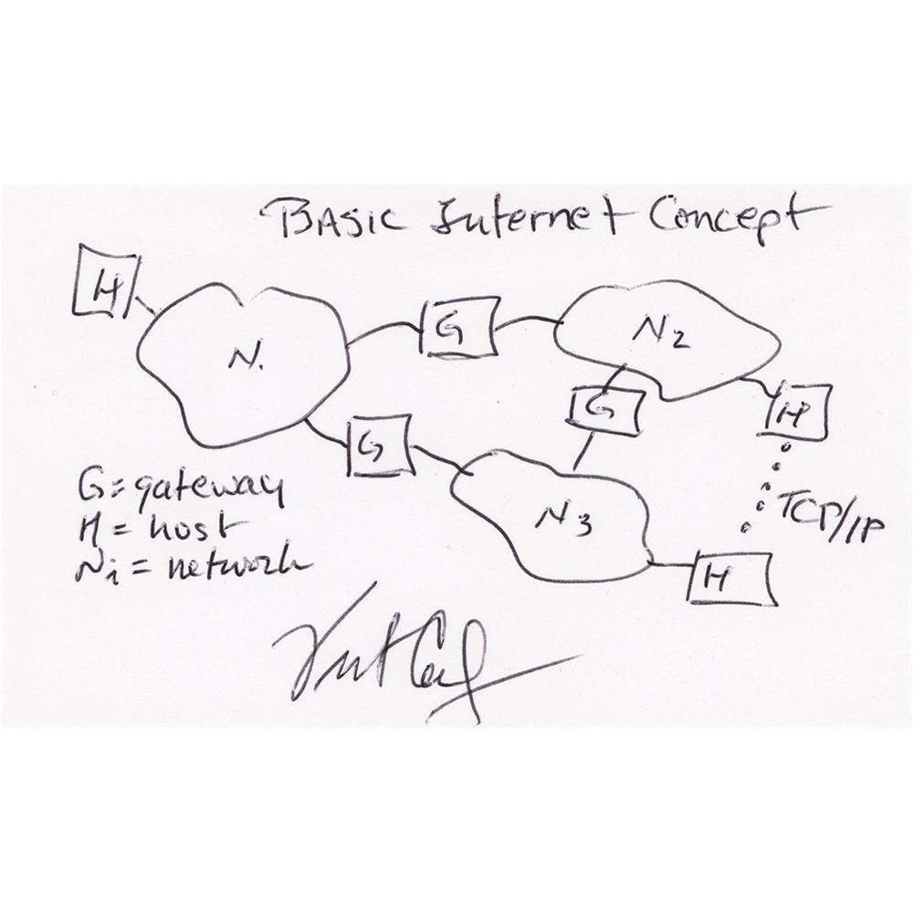 Original ballpoint sketch of the "Basic Internet Concept" accomplished by Cerf on a white 5 x 3 card, signed below, "Vint Cerf." In very fine condition.