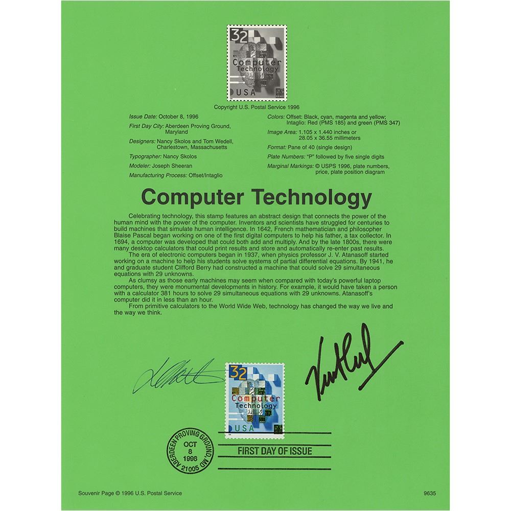 Philatelic souvenir sheet honoring the 1996 release of the 32-cent “Computer Technology” stamp, 8 x 10.5, postmarked below at Aberdeen Proving Ground, Maryland on October 6, 1996, with the referenced stamp affixed above, signed in black felt tip by Internet pioneers Vint Cerf and in blue ballpoint by Lawrence Roberts. In fine condition.