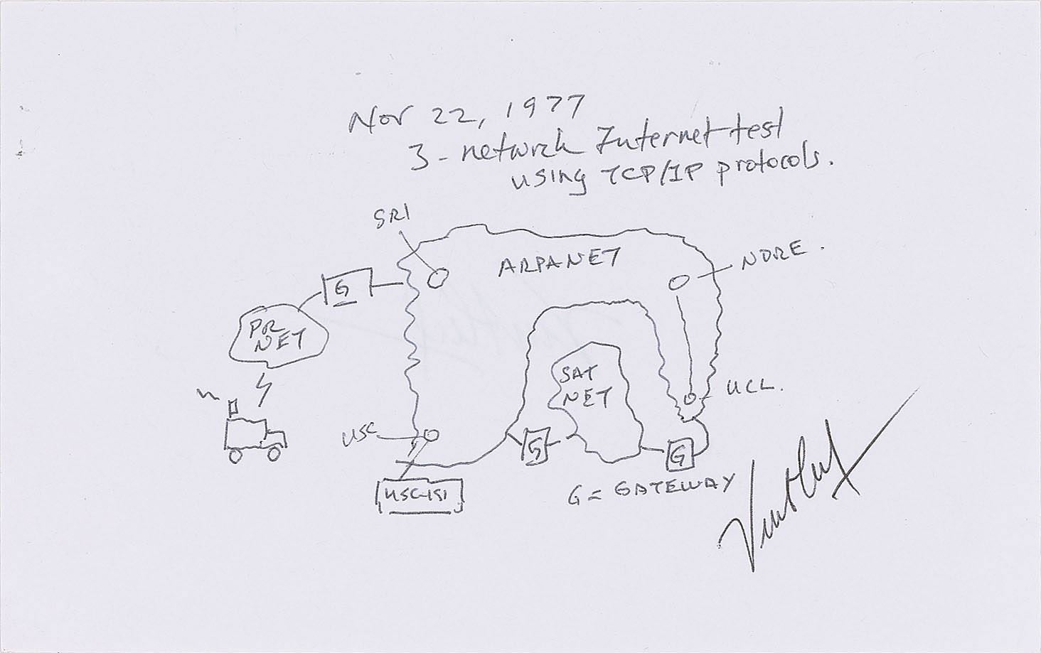 American Internet pioneer (born 1943) and one of 'the fathers of the Internet,' who developed TCP/IP technology and the first commercial email system. Two items: an original ballpoint sketch of the "3-network Internet test using TCP/IP protocols" on a white 8 x 5 sheet, signed below by Cerf; and a color glossy 10 x 8 photo of the handsomely dressed Cerf against a pixelated backdrop, signed in silver ink by Cerf, who adds, "One of the fathers of the Internet." In overall fine condition. Accompanied by a personal Google business card belonging to Cerf, who has signed the card in black felt tip.