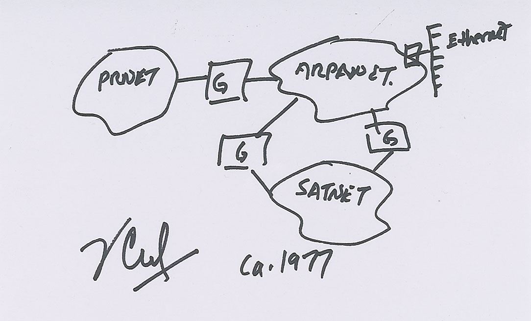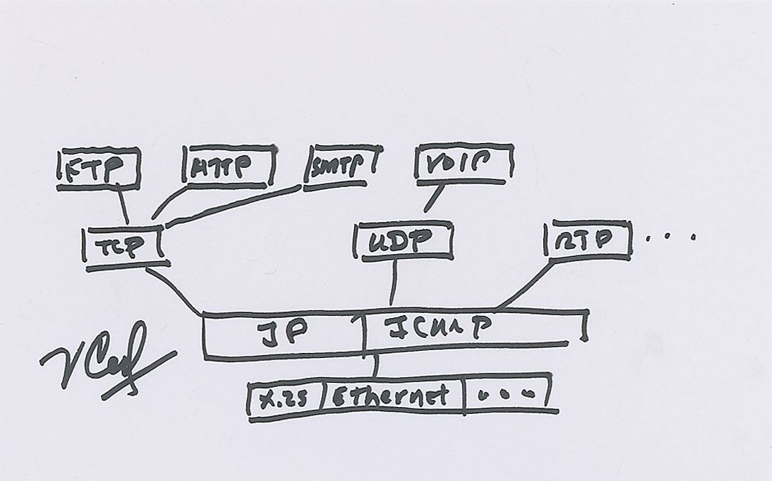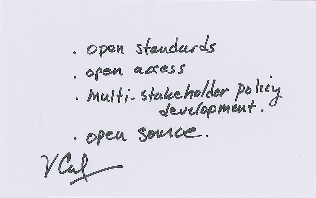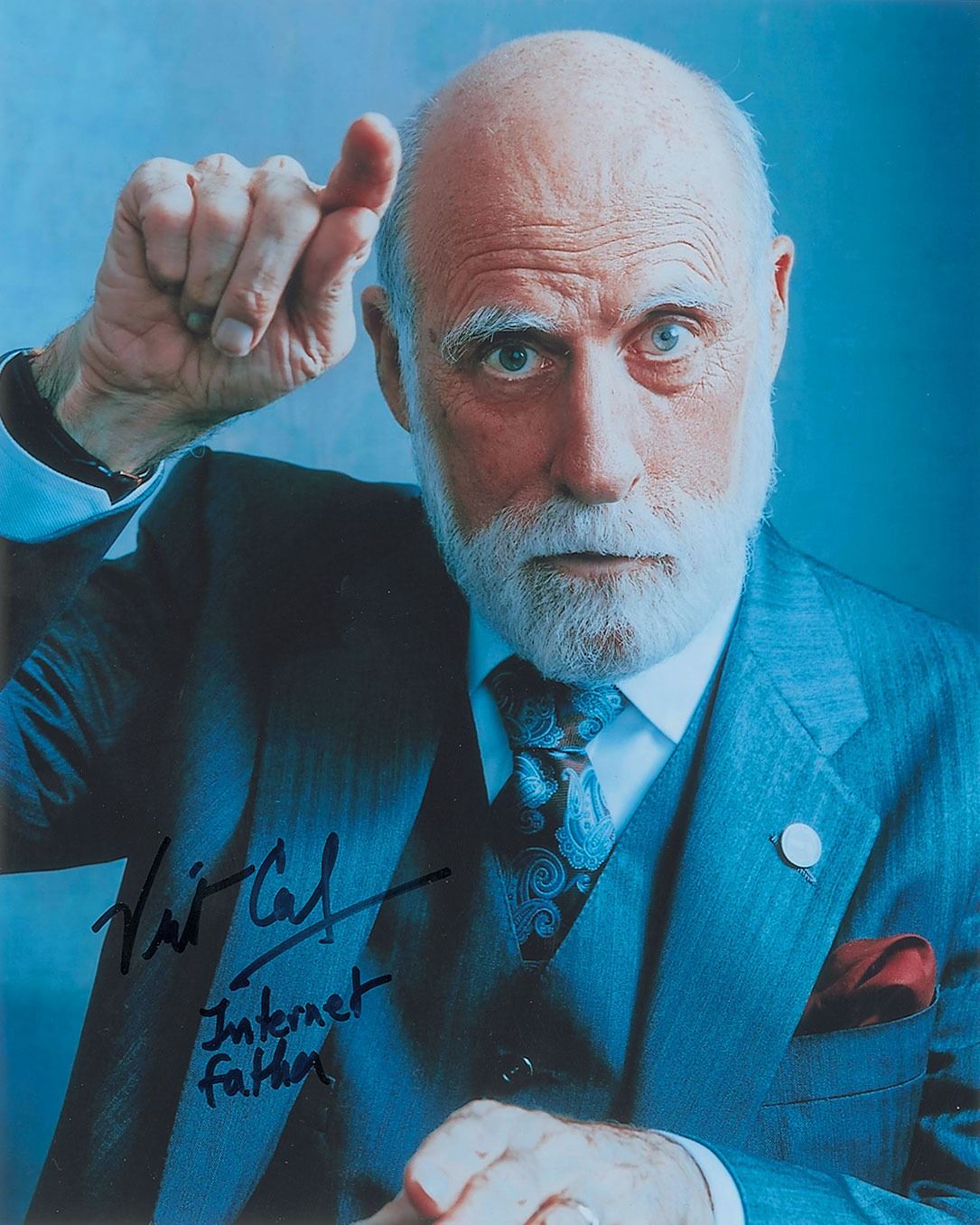 American Internet pioneer (born 1943) and one of 'the fathers of the Internet,' who developed TCP/IP technology and the first commercial email system. Four items: a color glossy 8 x 10 half-length photo of Vint Cerf in an explanatory pose, signed in black felt tip by Cerf, who adds "Internet father"; and a set of three white 8 x 5 sheets, each signed in black felt tip by Cerf, who draws connection diagrams related to ARPANET and internet layers, and writes a list of four open networking objectives. In overall fine condition, with a paperclip impression to the top edge of the photo. Accompanied by a personal Google business card belonging to Cerf, who has signed the card in black ballpoint.
