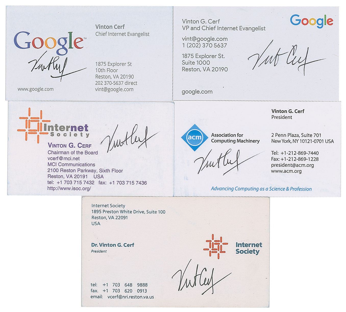 American Internet pioneer (born 1943) and one of 'the fathers of the Internet,' who developed TCP/IP technology and the first commercial email system. Group of five business cards, ranging in size from 3.5 x 2 to 4 x 2.25, each signed in black ink or ballpoint by Vint Cerf. Companies include: Google (2; VP and Chief Internet Evangelist), Internet Society (2; President and Chairman of the Board), and Association for Computing Machinery (President). In overall fine condition.