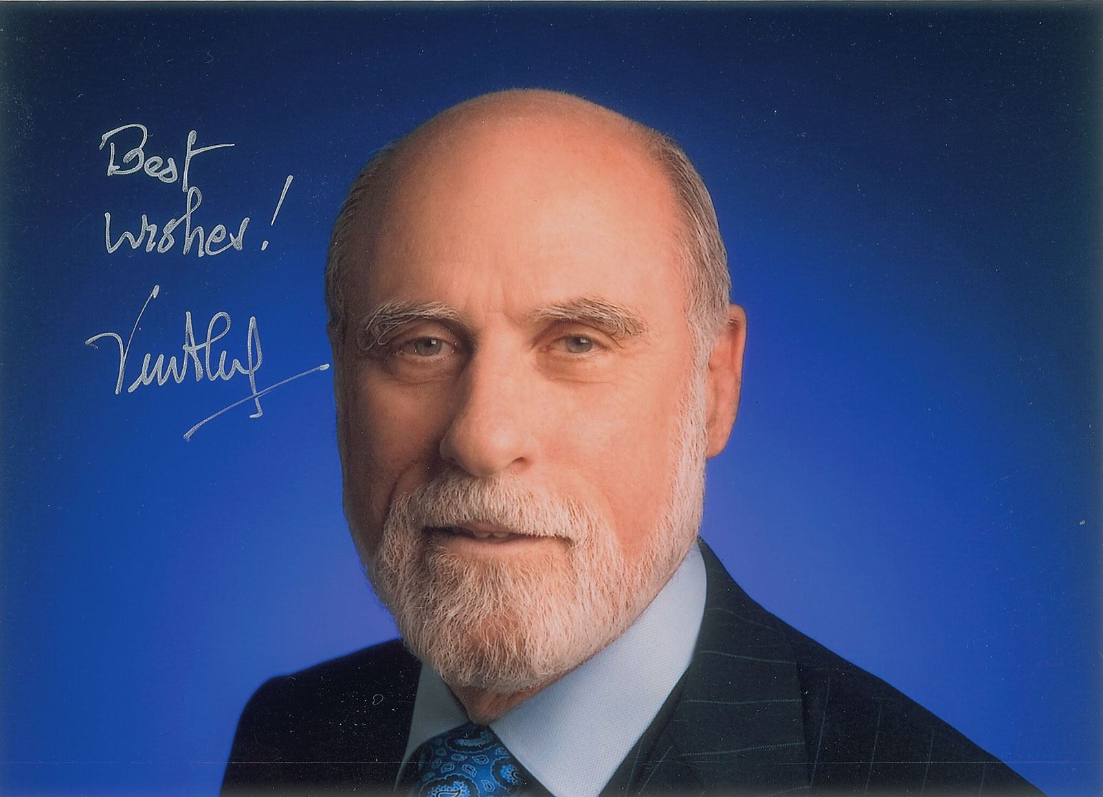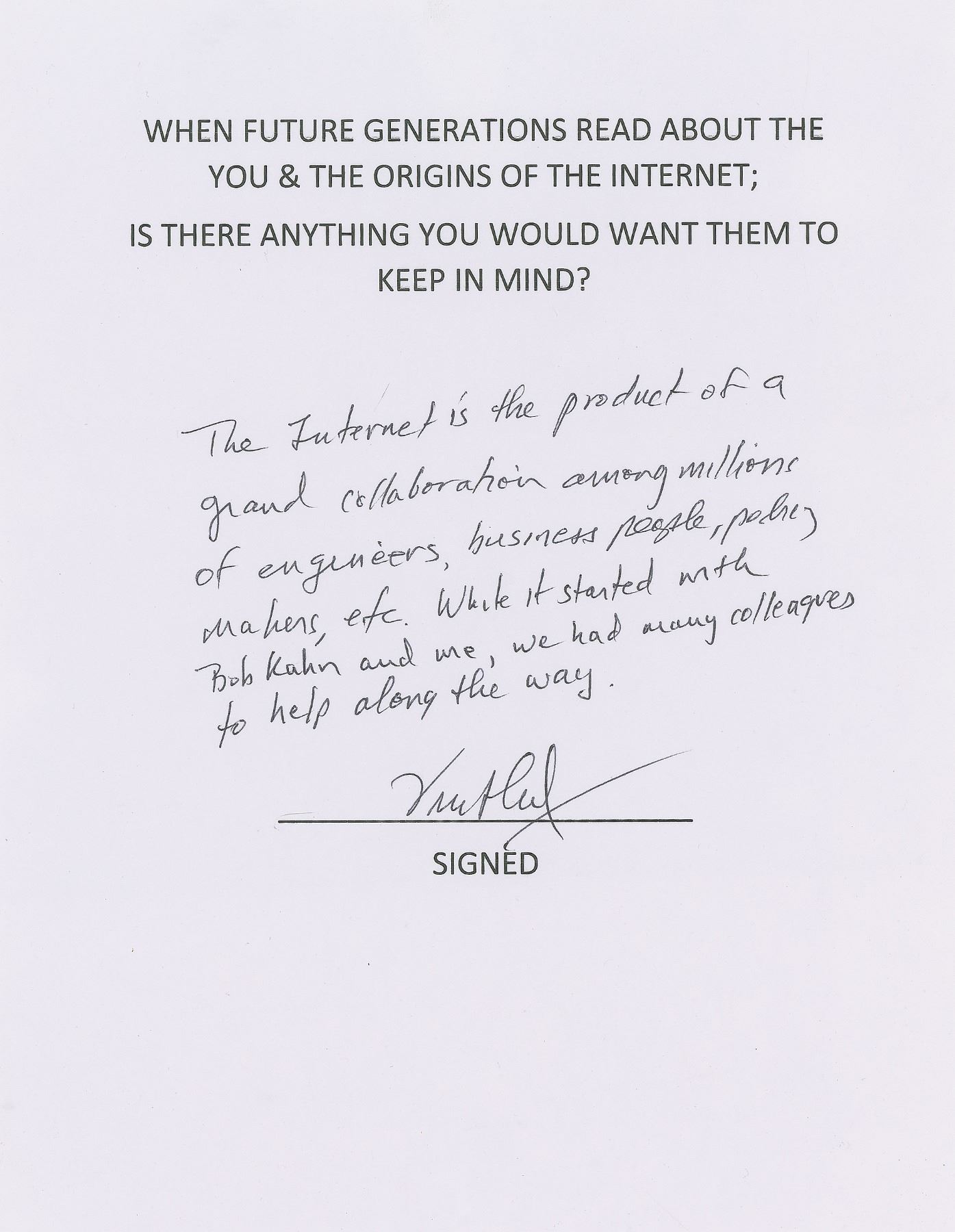 Two items: a color glossy 7 x 5 close-up photo, signed in silver ink, "Best wishes! Vint Cerf"; and an AQS on a white 8.5 x 11 sheet with typed question asking Cerf if there is anything future generations should remember concerning the origin of the Internet; Cerf's response: "The Internet is the product of a grand collaboration among millions of engineers, business people, policy makers, etc. While it started with Bob Kahn and me, we had many colleagues to help along the way." In overall very fine condition. Accompanied by a personal Google business card belonging to Cerf, who has signed the card in black ink.