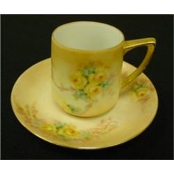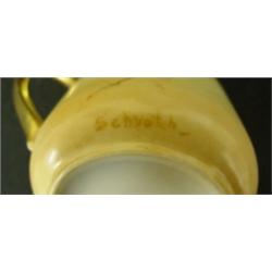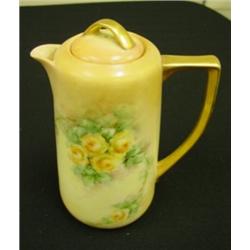 Hand painted porcelain chocolate set. 9" slender pot with gold decorated handles. Covered in delicate yellow roses with trailing green foliage. Muted background. Set of 6 cups & saucers in matched decoration. Modern gold tray. Circa early 1900's. 5-5/8" saucer. 3" cup. All pieces are signed Schroth. Condition: Mint