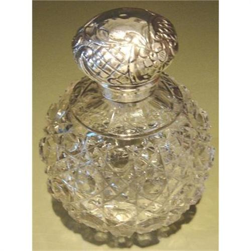 This is a great vintage cut glass vanity scent jar with a sterling top! The markings on it make it appear to be from Birmingham, England, possibly dating from 1901-1902. It has an anchor; the lion facing left; and a "b" seemingly from cycle VI. There are also initials JB inside a rectangle.The glass jar is intricately cut and has the starburst on the bottom. The neck is silver with ridges for a twist on top. The top has alternating florals and cross-hatched panels. The silver appears to be applied over a wooden base. The twist rings on the inside of the neck are slightly flattened. The top fits on fine, but it doesn't need to screw down as originally made. The top has a break in the silver above the hallmarks that you may be able to see in one of the photos. There are some minor dents on the top. The overall appearance is remarkably nice, however. US SHIPPING INCLUDES DELIVERY CONFIRMATION. <p>