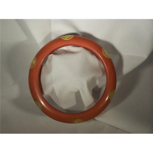 This is a beautiful vintage Bakelite six 6 Dot bangle bracelet. The bangle is a rich brownish orange color with perfect yellow swirl dots.