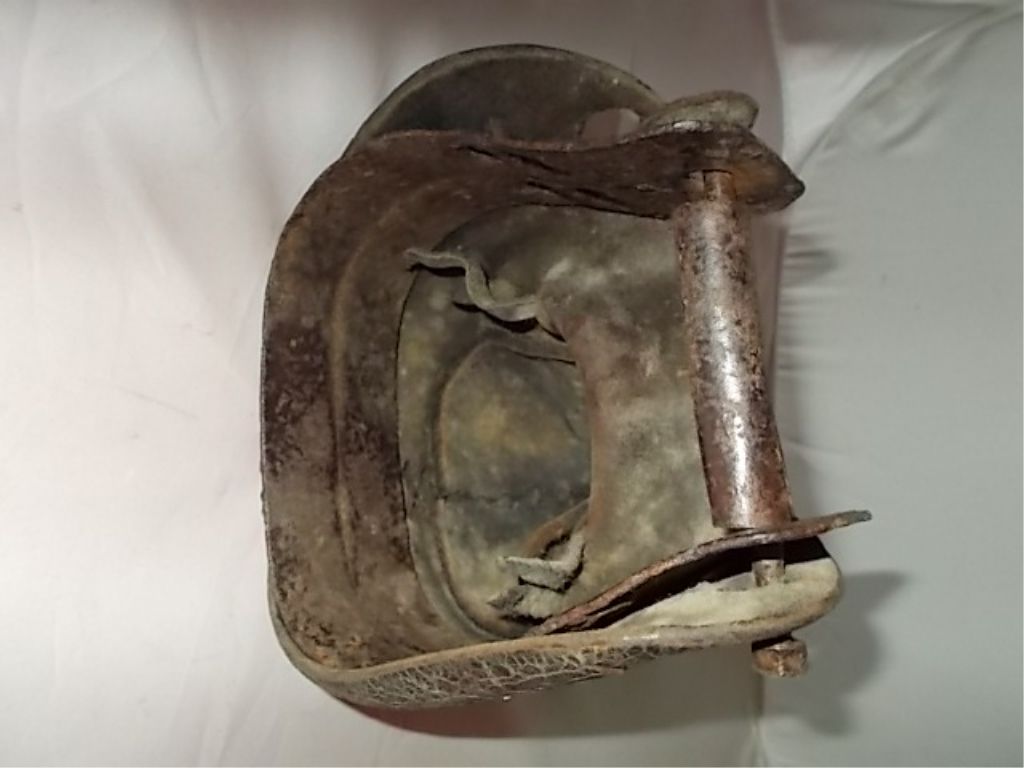 Leather has some surface cracks and it has a metal stirrup. Tapaderos were used in the :"OLD WEST" the same way they are used today they protect the cowboys feet & boots
