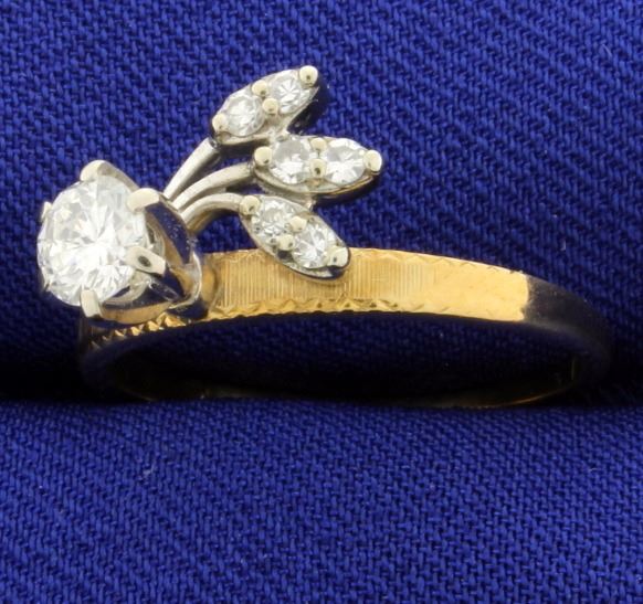 In 14K yellow and white gold. The center diamond is a high quality round brilliant .35 ct, G color/VS clarity. There are six .03 ct side stones that are also G color/VS clarity. Size7.5 2.6g