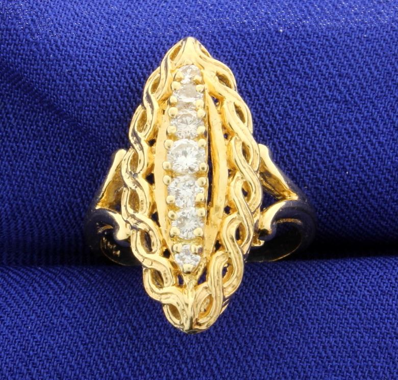 In 14K yellow gold, this ring contains one .14ct, two .10ct, two .05ct & two .03ct round diamonds - approximately 1/2ct total weight. All are high quality VS clarity/H Color. Size 6 1/4 6.3g