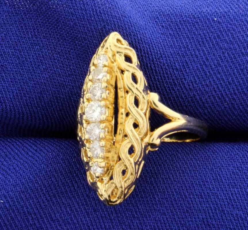 In 14K yellow gold, this ring contains one .14ct, two .10ct, two .05ct & two .03ct round diamonds - approximately 1/2ct total weight. All are high quality VS clarity/H Color. Size 6 1/4 6.3g