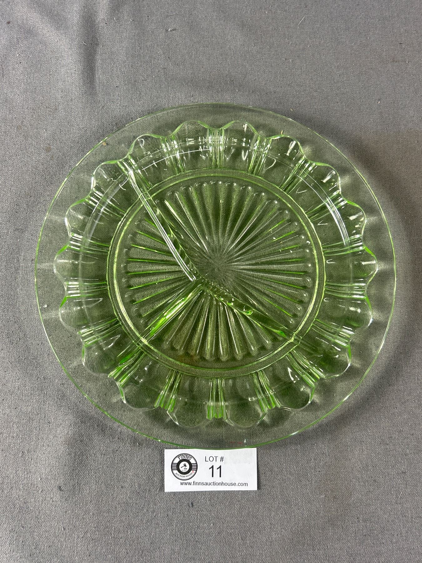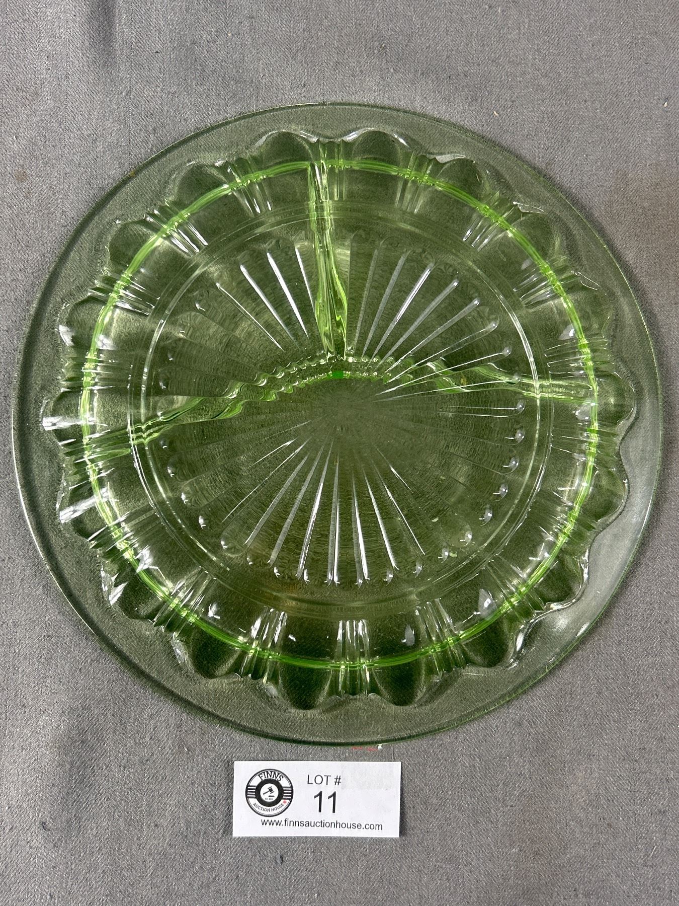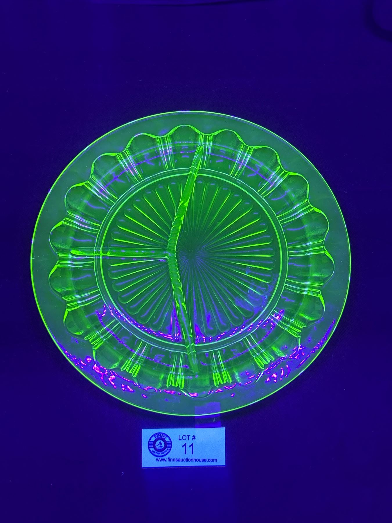 Vintage 10" Diam. Uranium Glass 3 Section Condiment Dish.