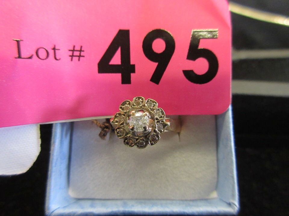 Center Diamond is just under 1/4 carat and is surrounded by 10 smaller Diamonds in a floral pattern.