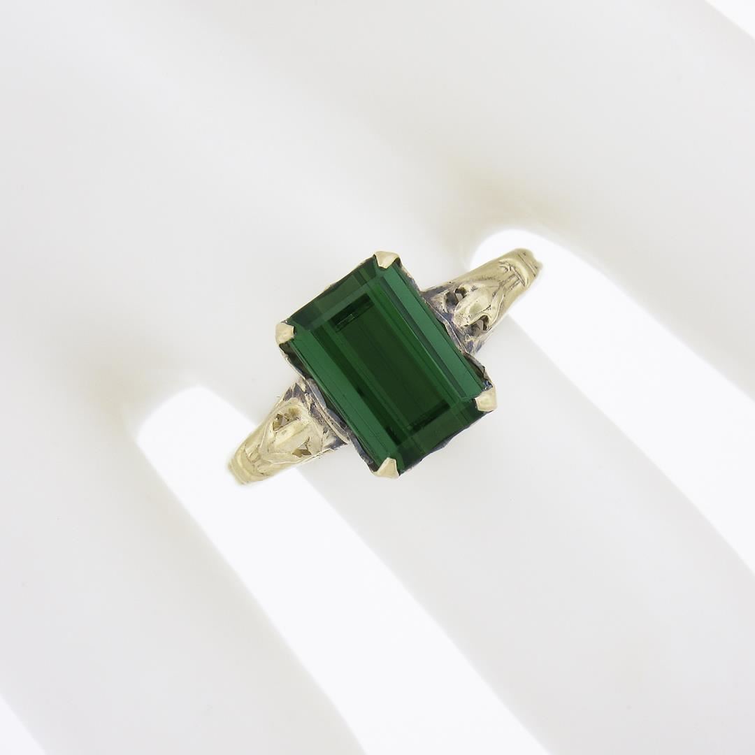 A vintage solid 10k yellow gold ring, with 1 emerald cut natural tourmaline (2.64ct). The ring is size 6.5, weighs a total of 2.14 grams, and measures 9.8mm wide.