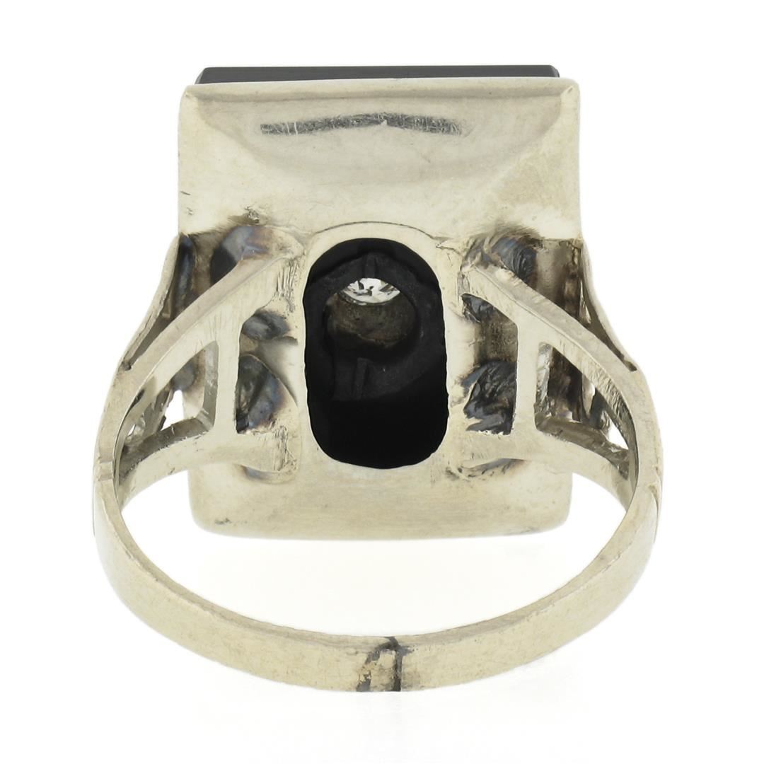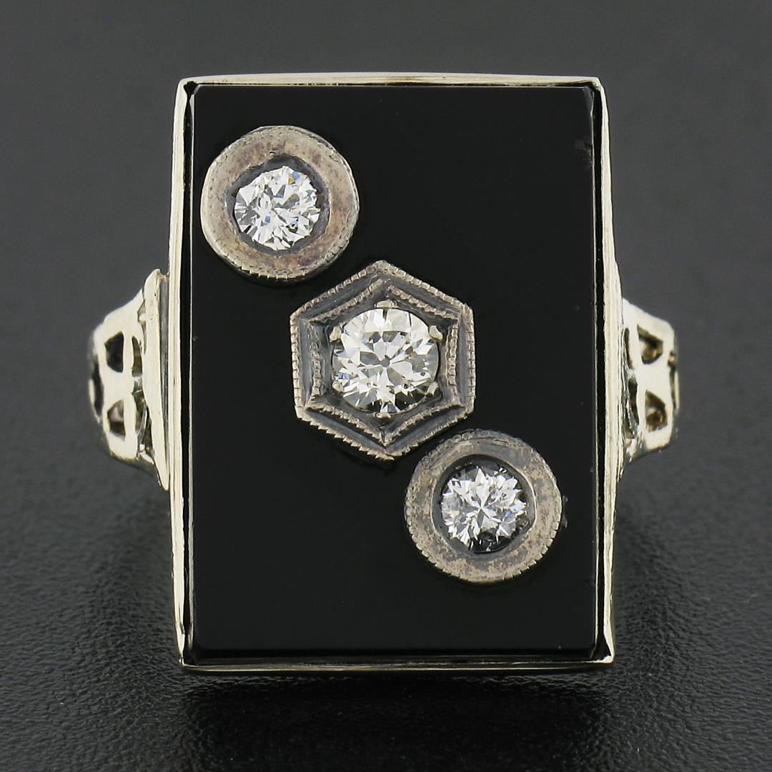 A vintage solid 10k white gold ring, with 1 rectangular cut natural black onyx (17.9x13mm), and 3 old European & old transitional cut natural diamonds (I/J - SI2-I1 ; 0.30ctw). The ring is size 6.0, weighs a total of 4.82 grams, and measures 18.9mm wide.