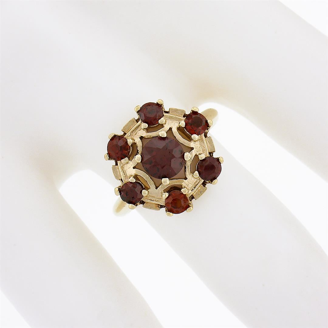 A solid 10k yellow gold cluster platter ring, with 7 round brilliant cut natural garnets (1.65ctw). The ring is size 6.0, weighs a total of 2.92 grams, and measures 13.80mm wide.