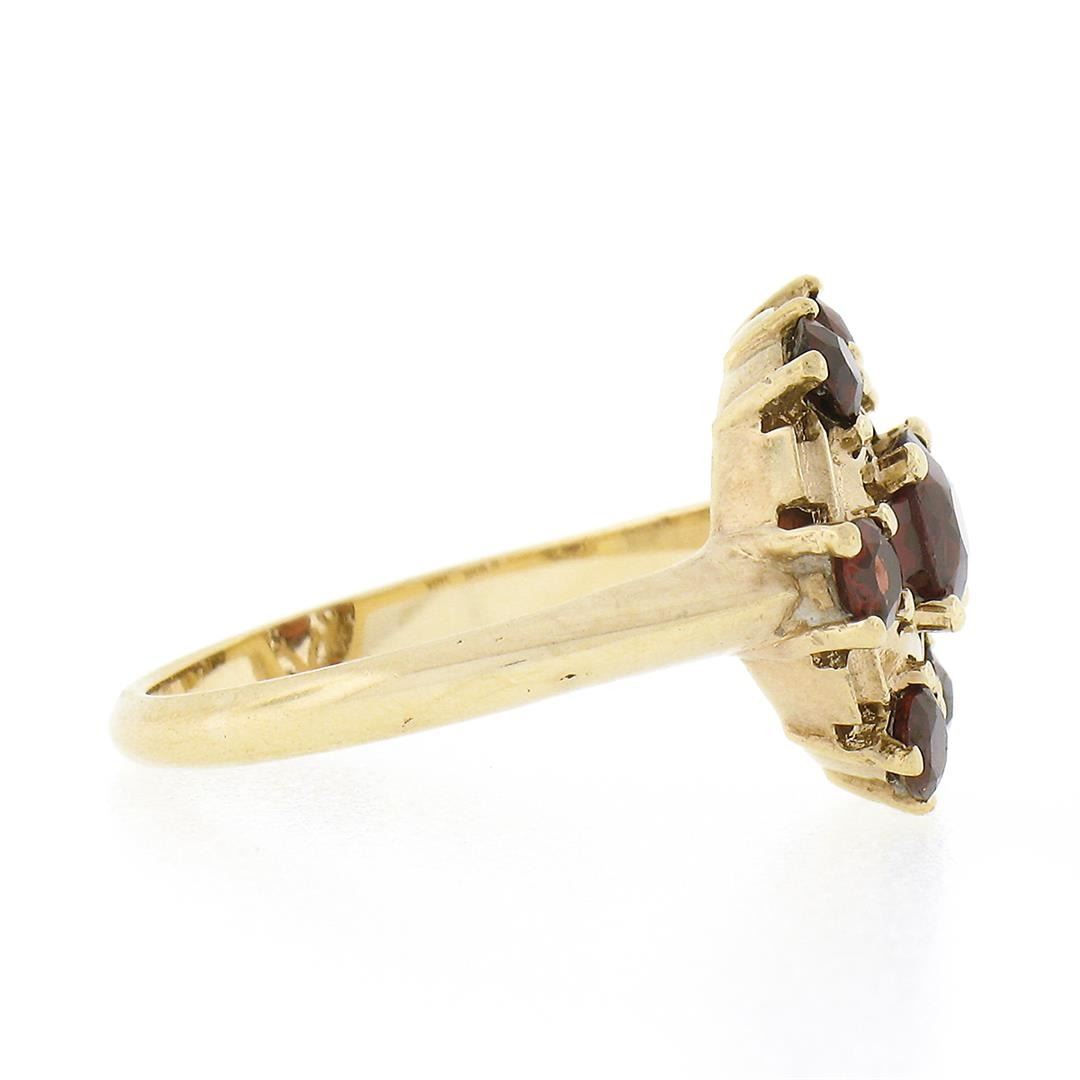 A solid 10k yellow gold cluster platter ring, with 7 round brilliant cut natural garnets (1.65ctw). The ring is size 6.0, weighs a total of 2.92 grams, and measures 13.80mm wide.