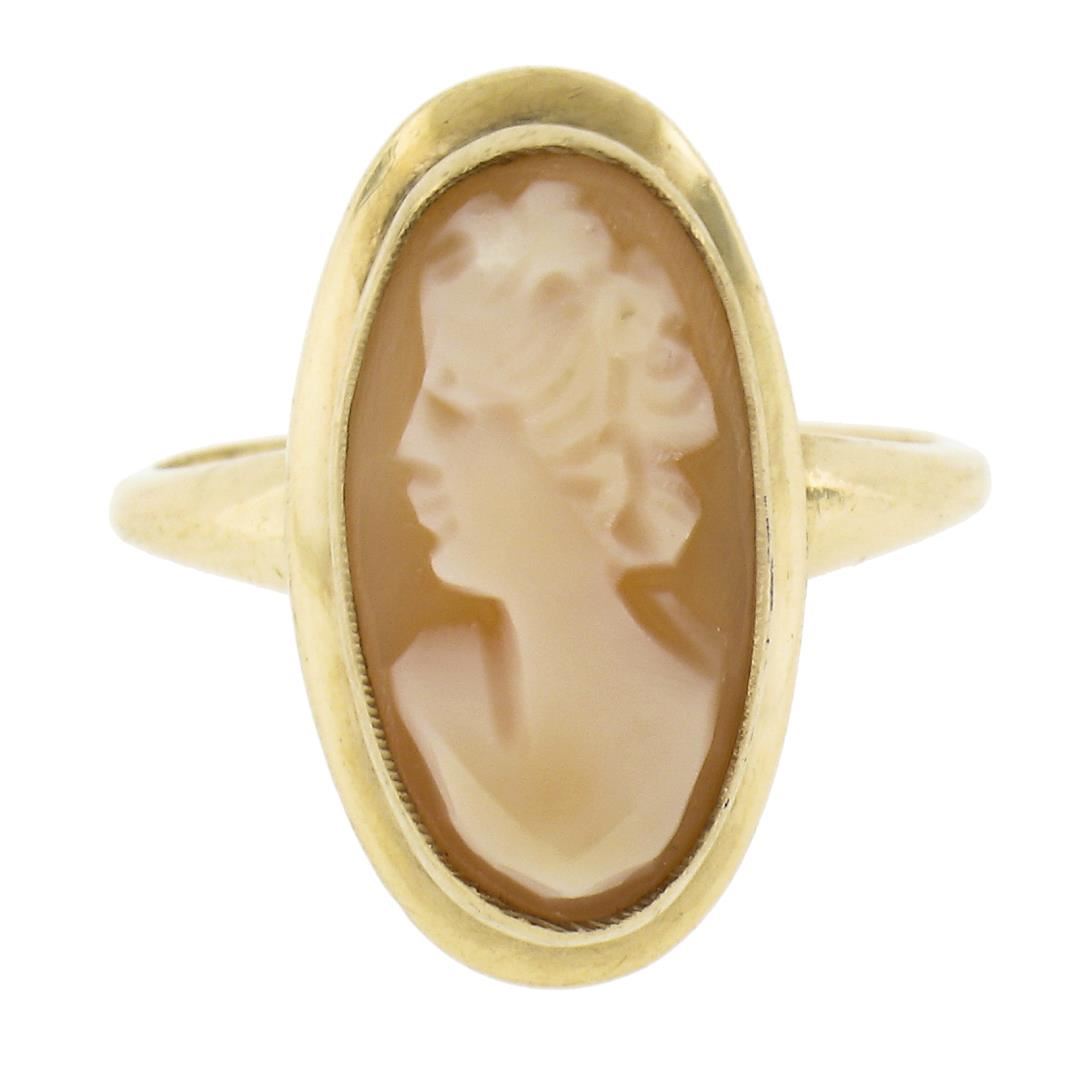 A vintage solid 10k yellow gold ringm with 1 oval shape carved cameo shell (15.8x8.6mm). The ring is size 5.5, weighs a total of 2.44 grams, and measures 18.6mm wide.