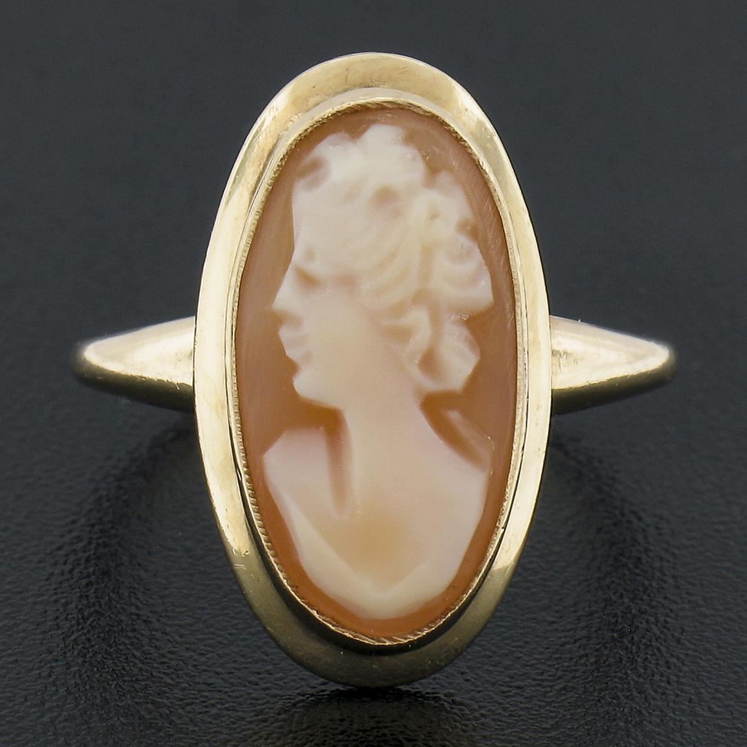 A vintage solid 10k yellow gold ringm with 1 oval shape carved cameo shell (15.8x8.6mm). The ring is size 5.5, weighs a total of 2.44 grams, and measures 18.6mm wide.