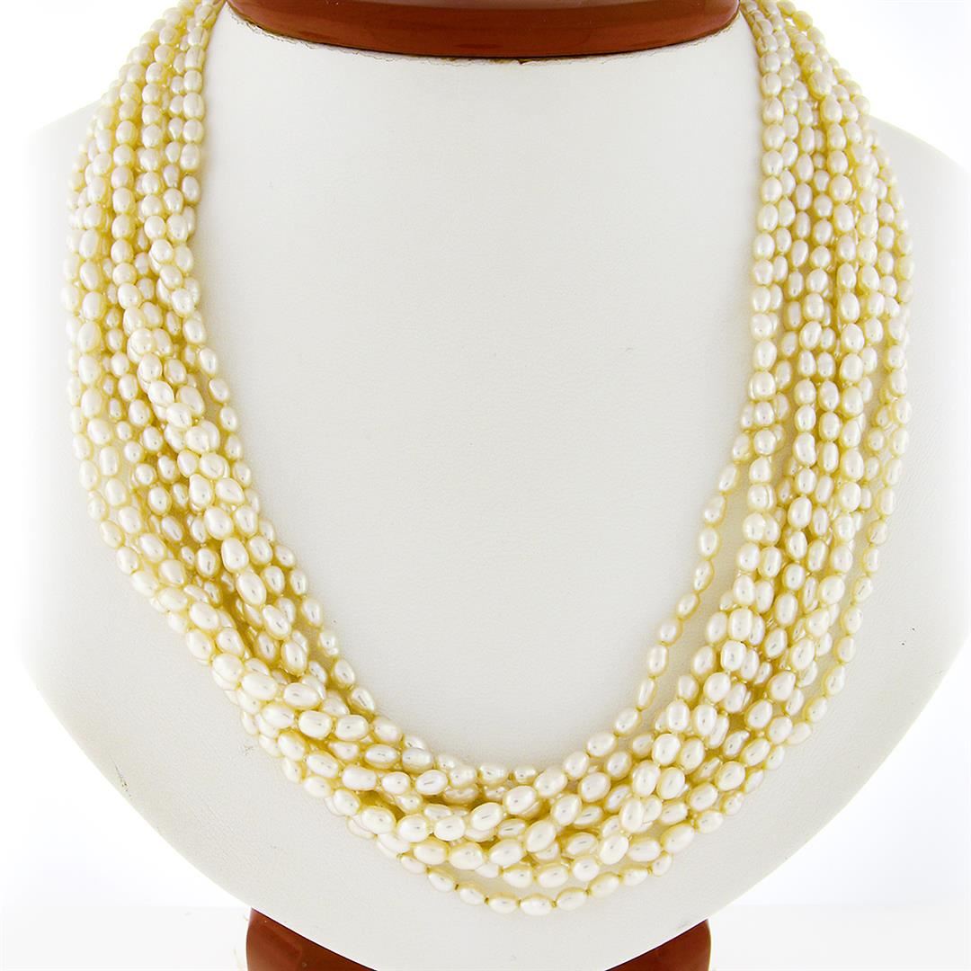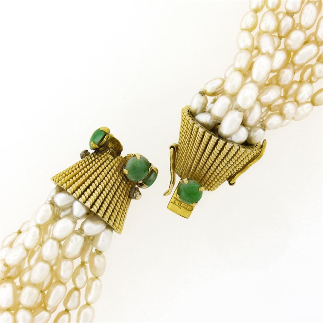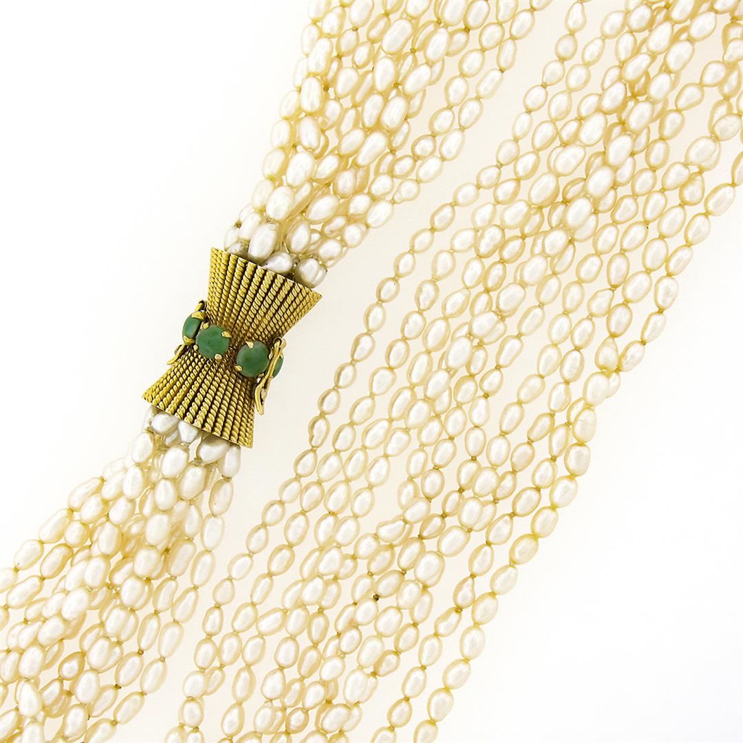 A vintage 11 strand necklace with 14k yellow gold clasp, featuring numerous od baroque shape freshwater pearls (4.70x3.50mm), and 6 round cabochon cut natural jade (4.75mm to 5.1mm each). 31 inch 11 strand link chain, 139.0 grams total weight, clasp measures 16.70mm in thickness.