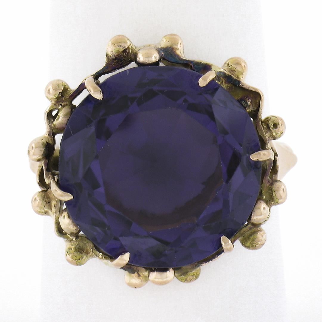 Vintage 12k Gold 15mm Round Synthetic Purple Stone Solitaire Ring w/ Bead Frame
