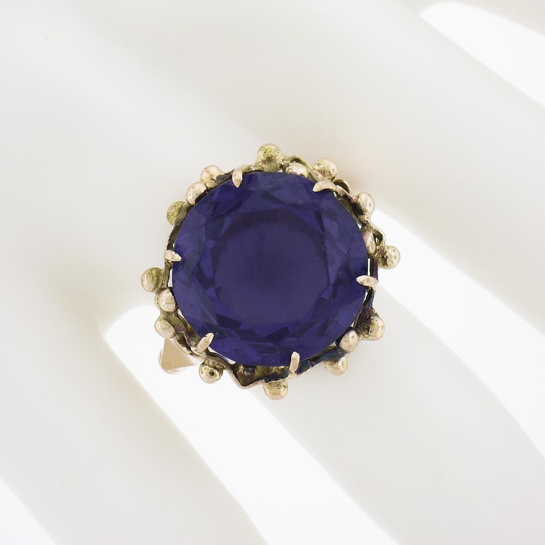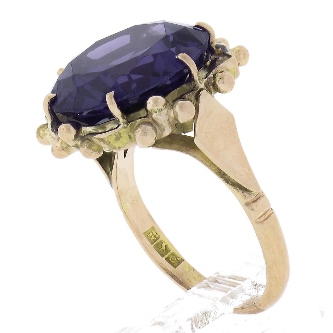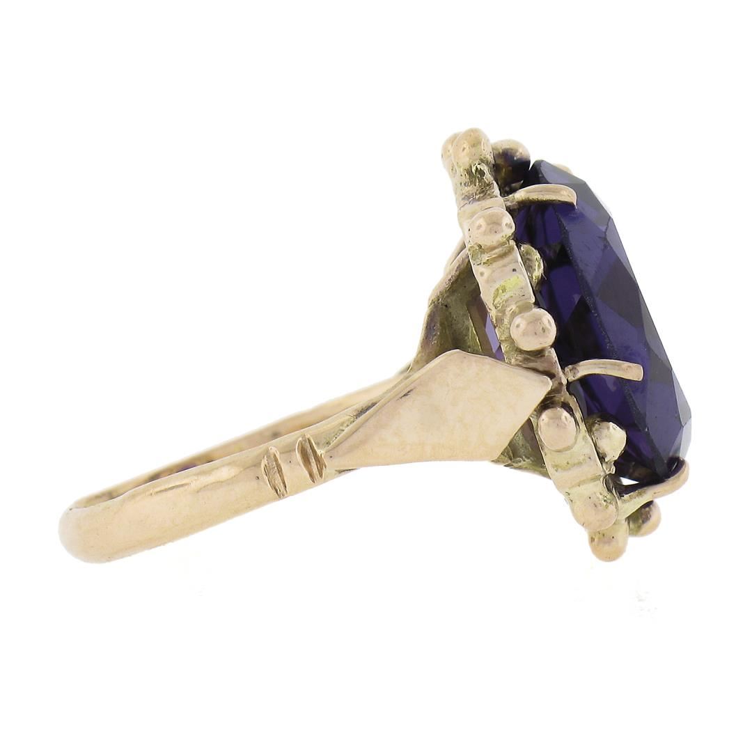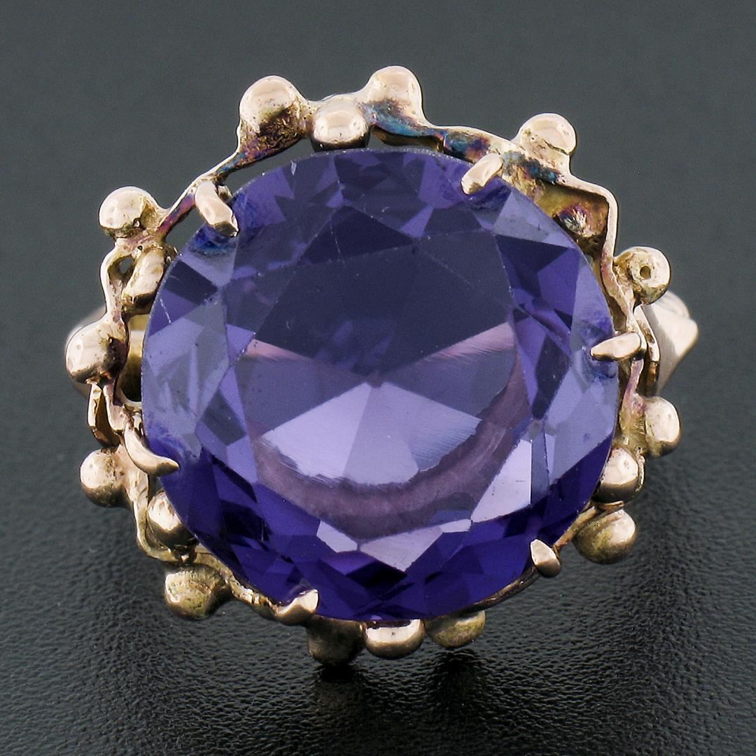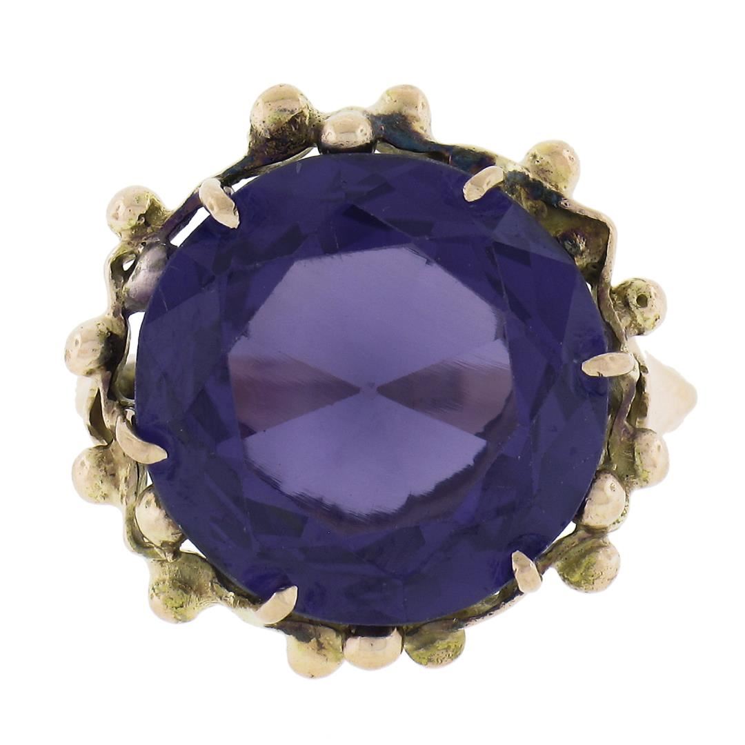 Vintage 12k Gold 15mm Round Synthetic Purple Stone Solitaire Ring w/ Bead Frame