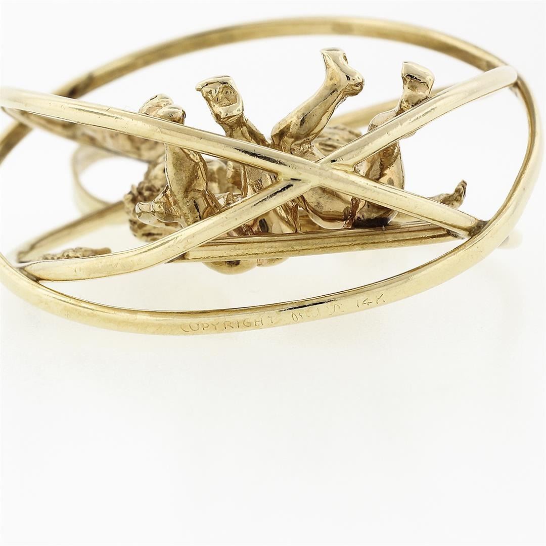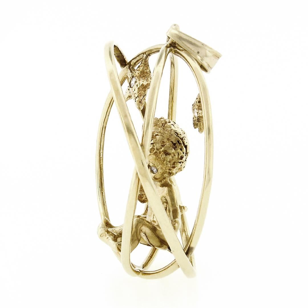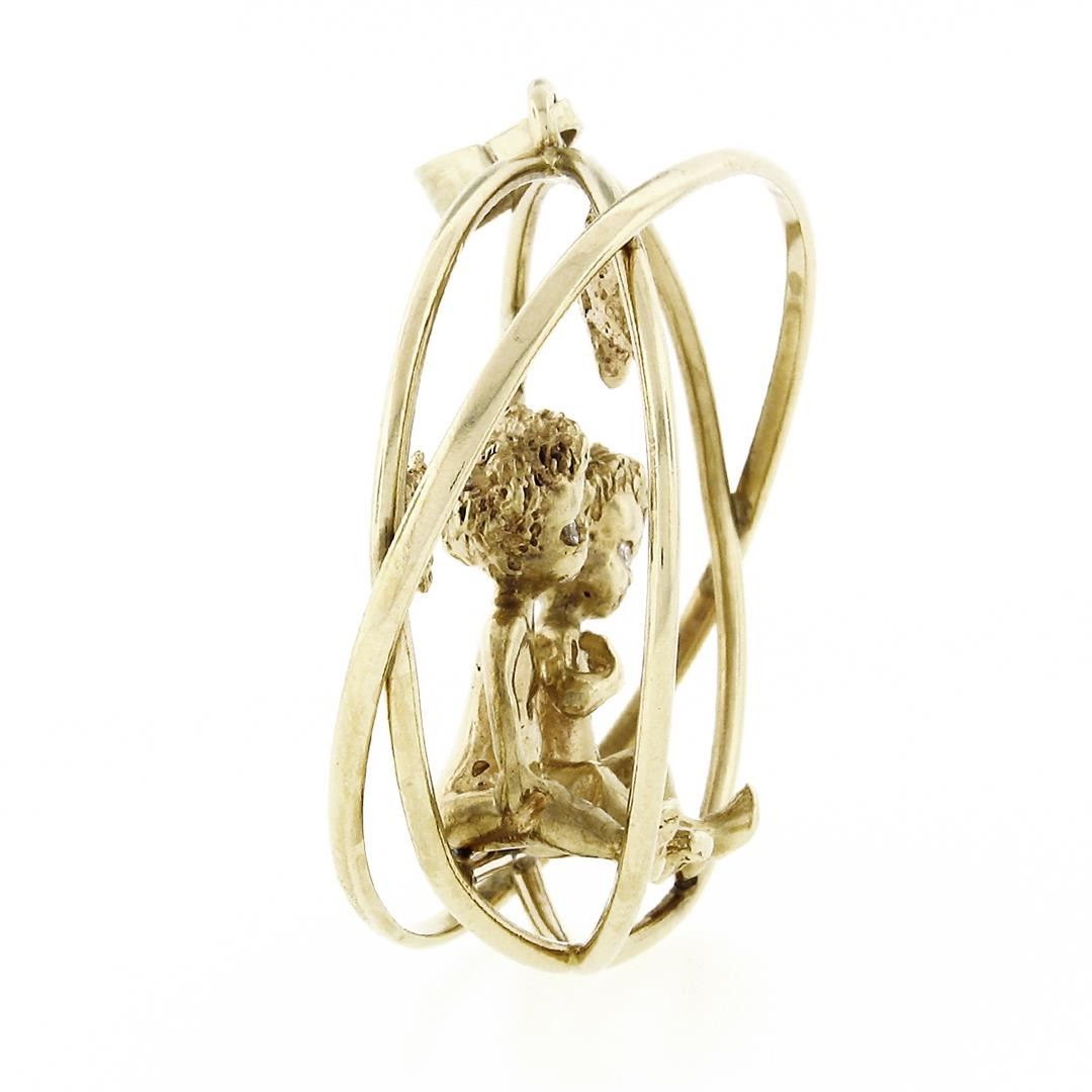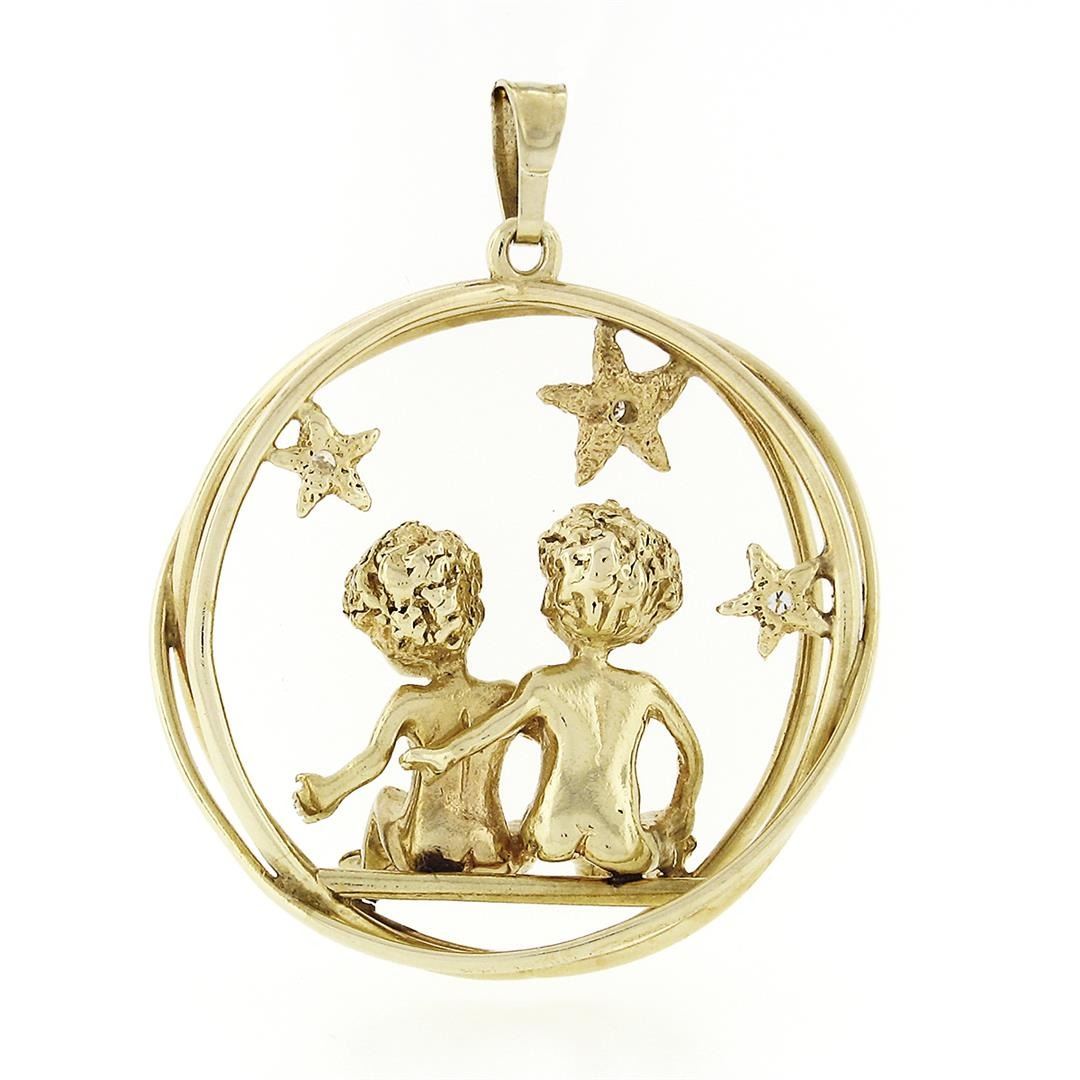 A vintage solid 14k yellow gold 3D gemini zodiac sign charm pendant, with 7 old single & round brilliant cut natural diamonds (E/F - VS1/VS2 ; 0.18ctw). The pendant weighs a total of 24.96 grams, measures 50.4x38mm including the bail, and the inside of the bail measures 8.5x5.9mm.