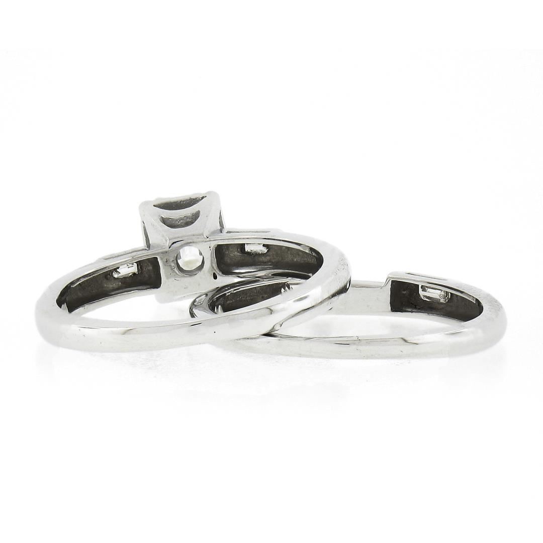 A vintage solid 14k white gold engagement and band ring set, with 1 emerald cut natural diamond (H - VS1 ; 4.6x3.6mm / 0.30ct), and 4 baguette cut natural diamonds (G/H - VS1/VS2 ; 0.20ctw). The ring is size 5.0, weighs a total of 3.39 grams, and measures 6.55mm wide.