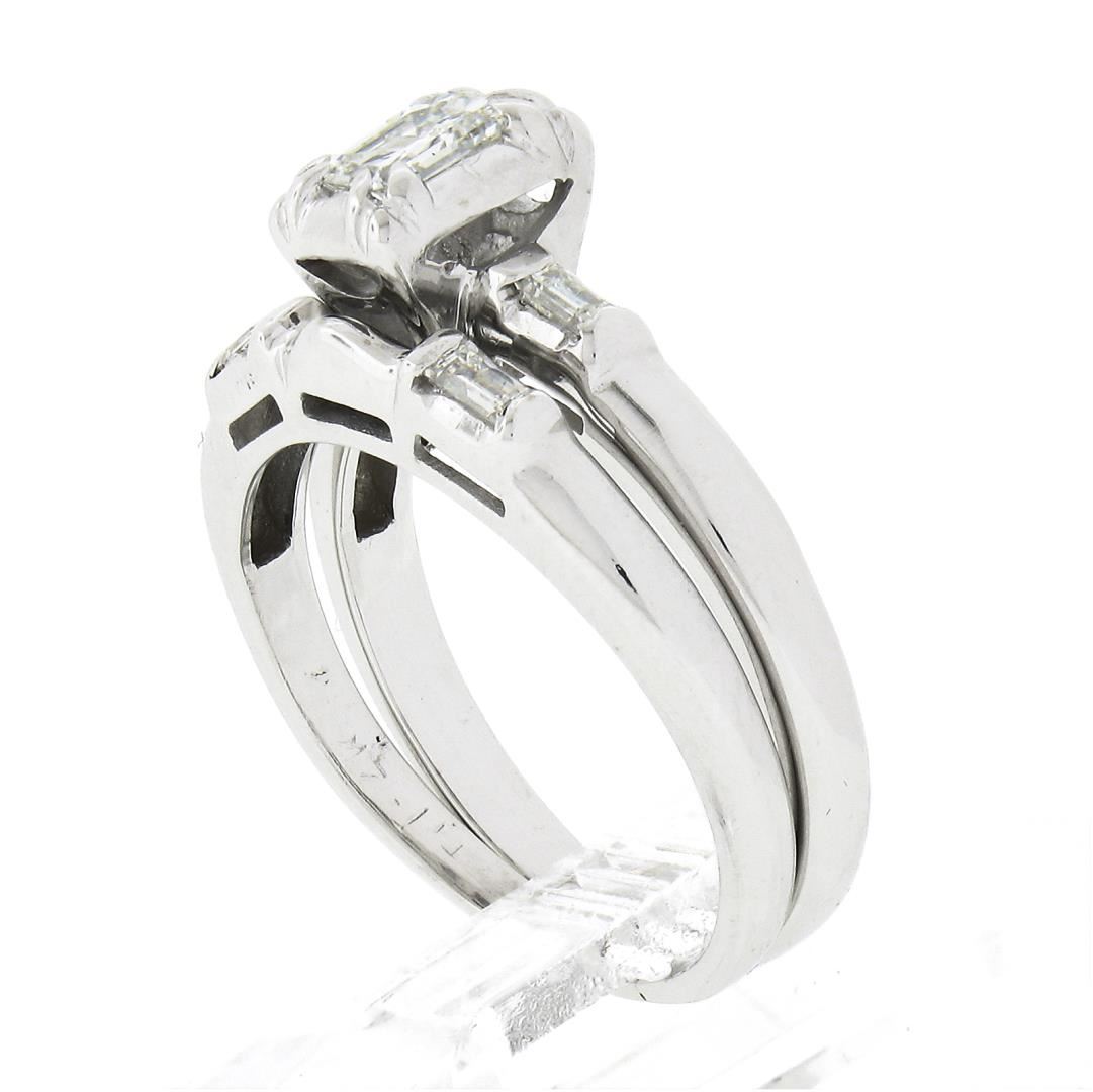 A vintage solid 14k white gold engagement and band ring set, with 1 emerald cut natural diamond (H - VS1 ; 4.6x3.6mm / 0.30ct), and 4 baguette cut natural diamonds (G/H - VS1/VS2 ; 0.20ctw). The ring is size 5.0, weighs a total of 3.39 grams, and measures 6.55mm wide.