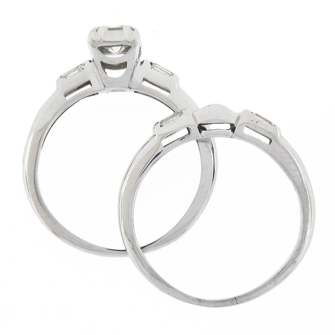 A vintage solid 14k white gold engagement and band ring set, with 1 emerald cut natural diamond (H - VS1 ; 4.6x3.6mm / 0.30ct), and 4 baguette cut natural diamonds (G/H - VS1/VS2 ; 0.20ctw). The ring is size 5.0, weighs a total of 3.39 grams, and measures 6.55mm wide.