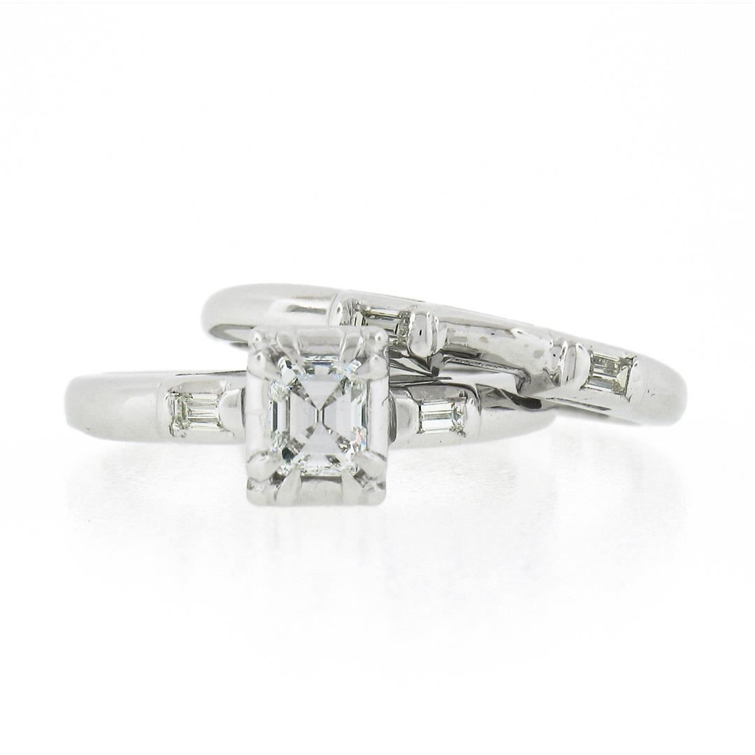 A vintage solid 14k white gold engagement and band ring set, with 1 emerald cut natural diamond (H - VS1 ; 4.6x3.6mm / 0.30ct), and 4 baguette cut natural diamonds (G/H - VS1/VS2 ; 0.20ctw). The ring is size 5.0, weighs a total of 3.39 grams, and measures 6.55mm wide.