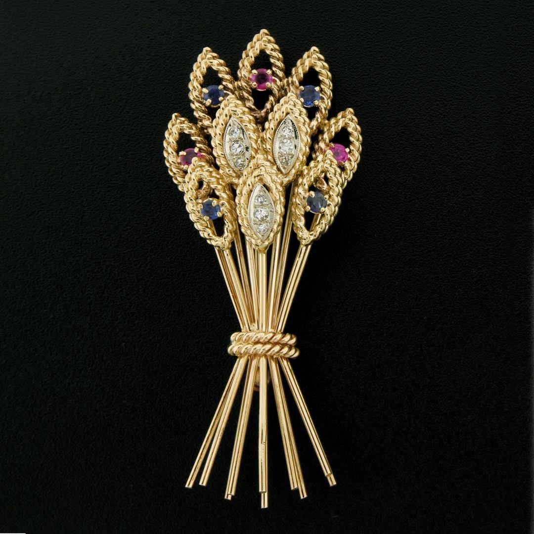 A vintage solid 14k yellow gold brooch, with 4 round brilliant cut natural sapphires (0.20ctw), and 3 round brilliant cut natural rubies (0.15ctw), and 9 single cut natural diamonds (I/J - VS2/SI1 ; 0.18ctw). Measures 62.65x26.30mm and weighs a total of 13.01 grams.