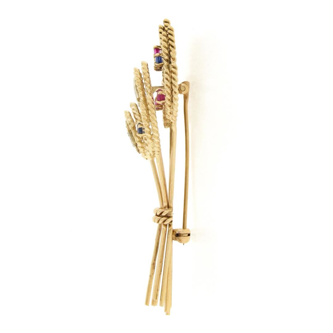 A vintage solid 14k yellow gold brooch, with 4 round brilliant cut natural sapphires (0.20ctw), and 3 round brilliant cut natural rubies (0.15ctw), and 9 single cut natural diamonds (I/J - VS2/SI1 ; 0.18ctw). Measures 62.65x26.30mm and weighs a total of 13.01 grams.