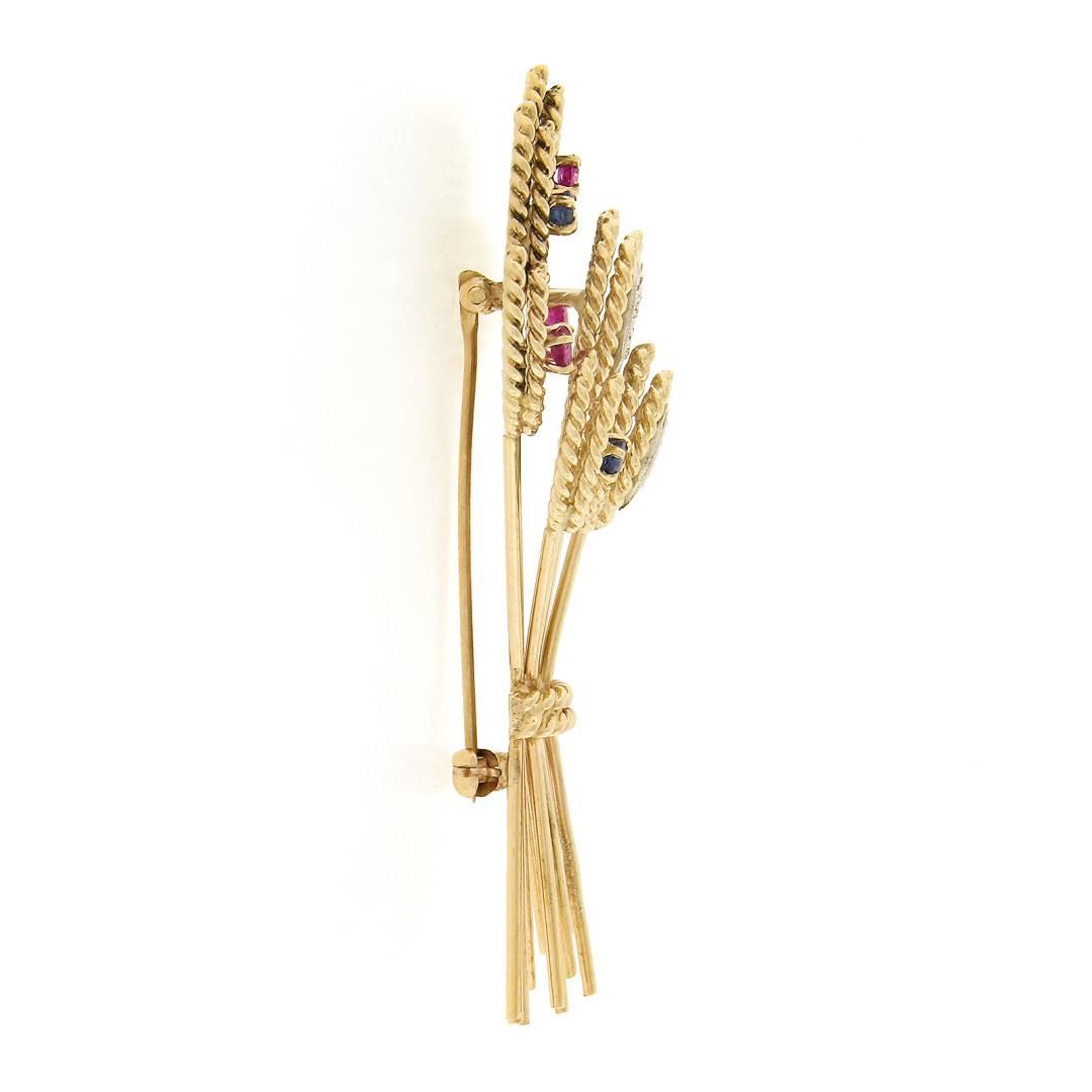A vintage solid 14k yellow gold brooch, with 4 round brilliant cut natural sapphires (0.20ctw), and 3 round brilliant cut natural rubies (0.15ctw), and 9 single cut natural diamonds (I/J - VS2/SI1 ; 0.18ctw). Measures 62.65x26.30mm and weighs a total of 13.01 grams.