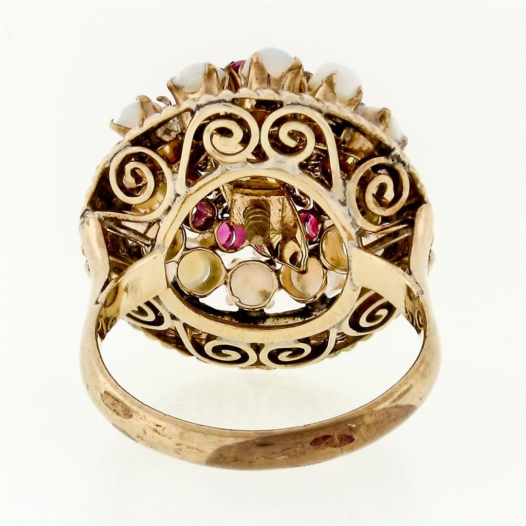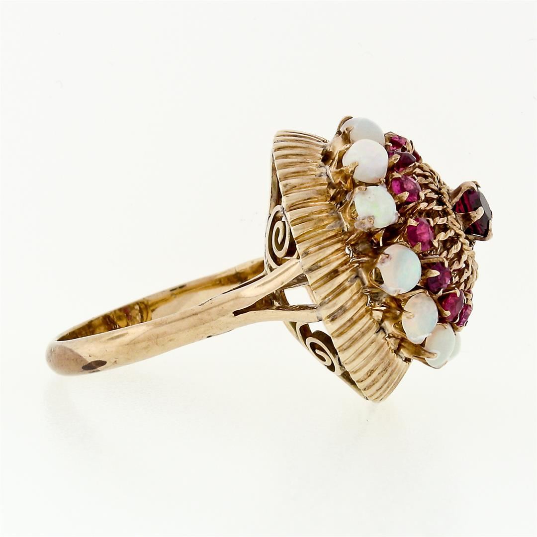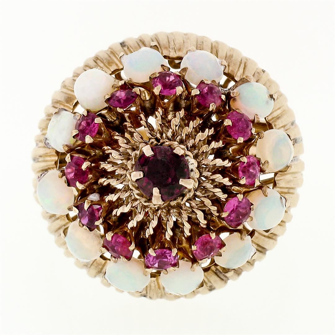 A solid 14k yellow gold ring, with 12 round cabochon cut natural opals (3mm), and 13 round cut natural rubies (0.55ctw). The ring is size 6.5, weighs a total of 5.44 grams, and measures 19.1mm wide.