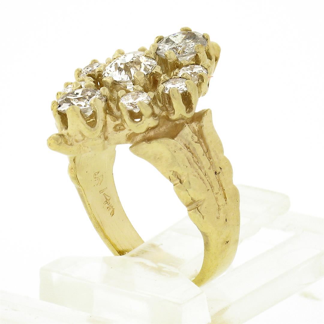 A solid 14k yellow gold ring, with 3 old european cut natural diamonds (H/ - SI1/I1 ; 0.90ctw), and 6 old transitional cut natural diamonds (H/I - VS2 ; 0.30ctw). The ring is size 2.0, weighs a total of 4.07 grams, and measures 17.75mm wide.